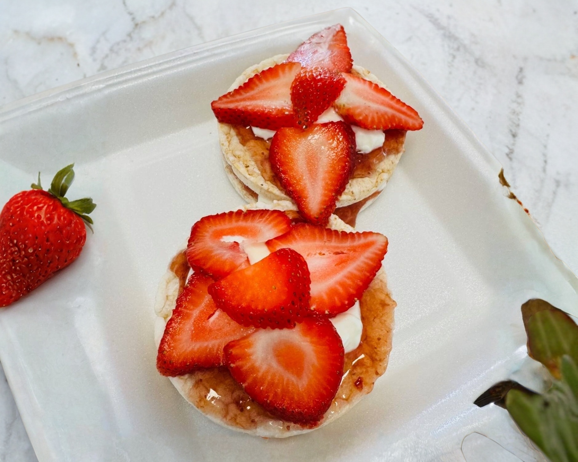 4 Rice cakes con fresa, yogurt griego, granola y mermelada Smuckers sin calorías.
