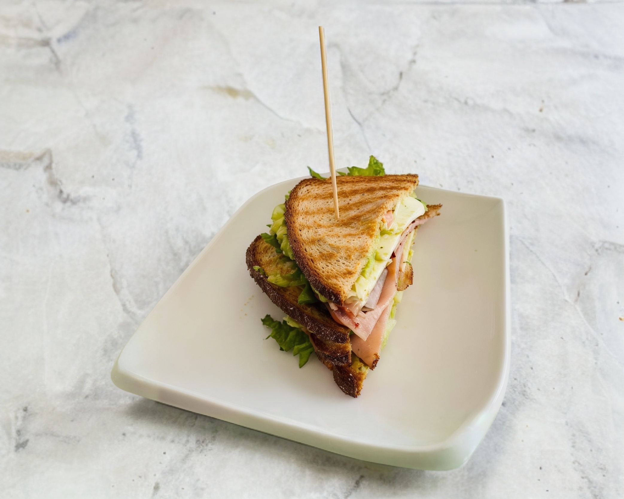 Sandwich tostado de jamón de pavo, lechuga, tomate, queso panela reducido en grasa, aguacate, y mayolight.