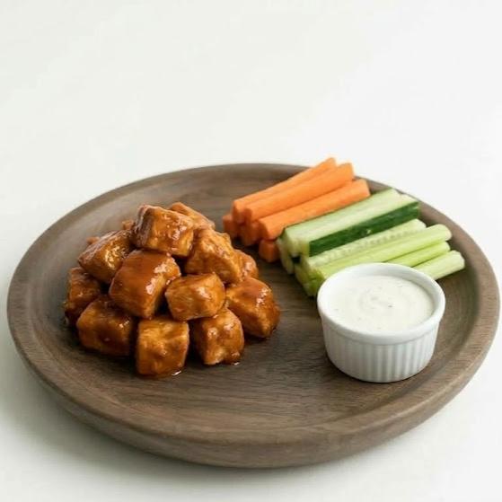 Cubos de pechuga de pollo naturales (200 gr) sin empanizar bañados en salsa buffalo acompañados de tiras de pepino, zanahoria y apio. Incluye aderezo ranch.
