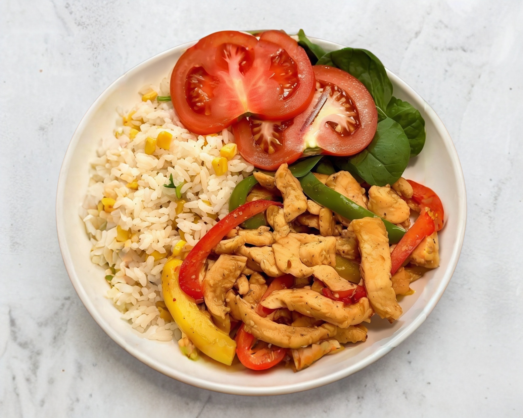 Fajitas de pollo al a plancha con pimientos, cebolla y tomate, con guarniciones Arroz integral y ensalada de lechuga con tomate y aguacate. (1 paquete de 3 tostaditas salmas)