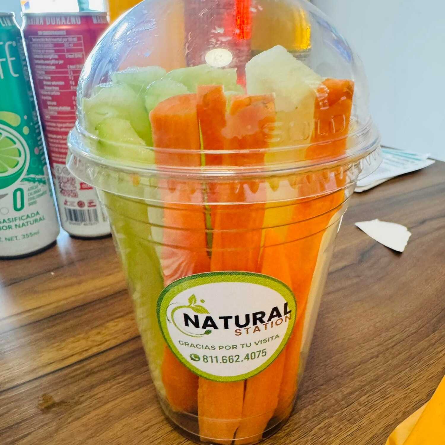 Coctel de pepino, zanahoria y jicama en tiras acompañado de limón y aparte botecito de chamoy sin calorías.