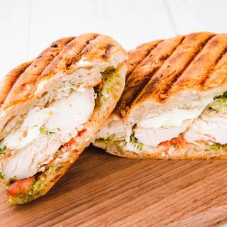 Panini de fajitas de pollo a la plancha, queso mozarella, tomate, cebolla morada, aguacate y moyochipotle.