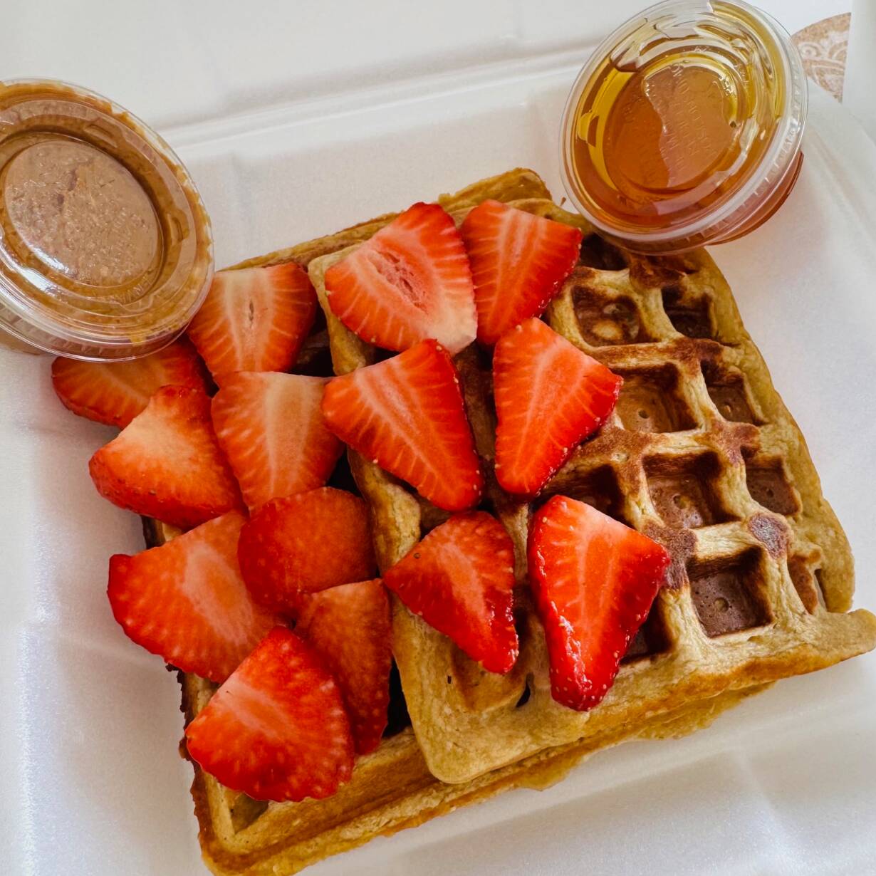 Deliciosos waffles a base de avena y platano, endulzados con monkfruit y fruta. Incluye miel.