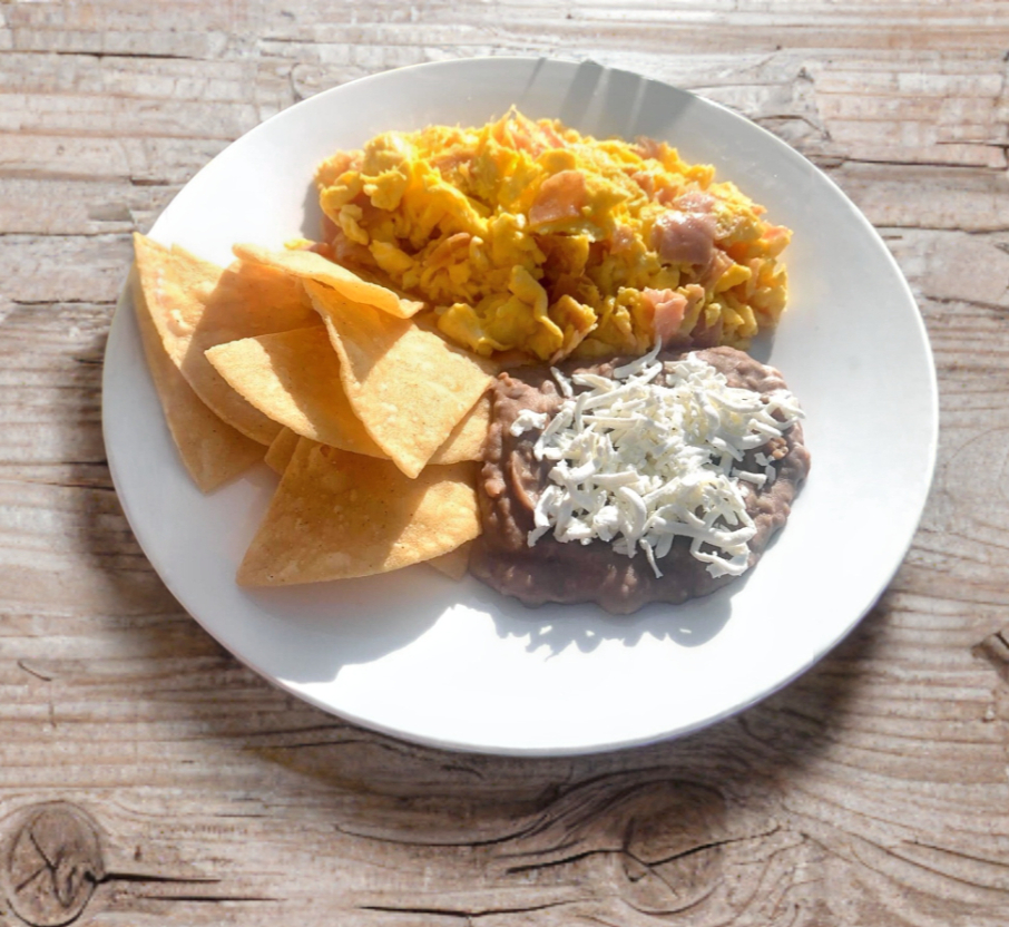 A la mexicana / Jamón / Revuelto / Espinacas + Frijoles con queso panela + Totopos + Salsa del día + Tortillas de maíz + Sal