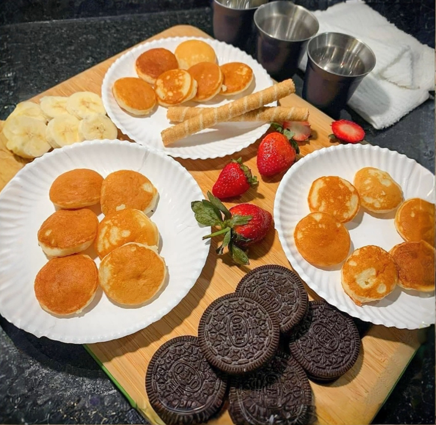 12 piezas mini de hotcakes + Mantequilla + Mermelada + Maple