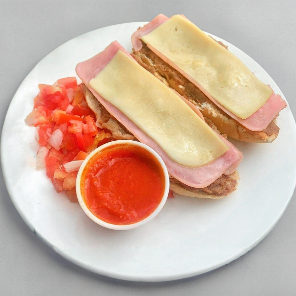 Bolillo caliente + Jamón + Queso manchego + Huevo + Mayonesa + Frijoles + Aguacate + Salsa