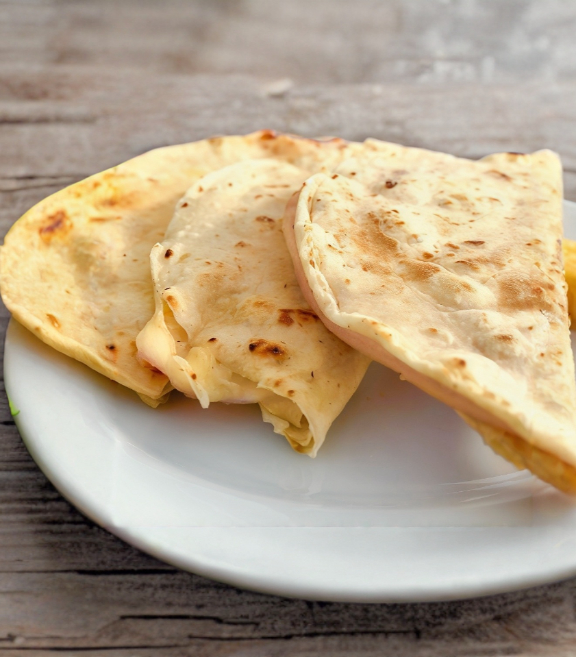 2 tortillas de maíz calientes + Queso manchego + Jamón + Salsa del día + Sal