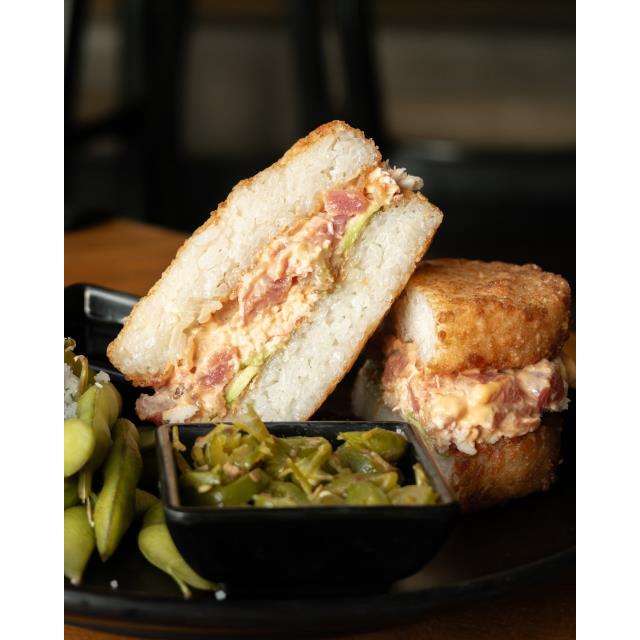 Hamburguesa asiática, hecha con buns de arroz frito rellena de atún spicy, tampico y aguacate con aderezo chipotle. Edamames al Vapor Limonada