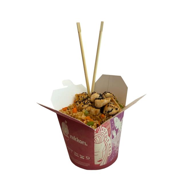 Pollo en salsa teriyaki sobre arroz frito o gohan.