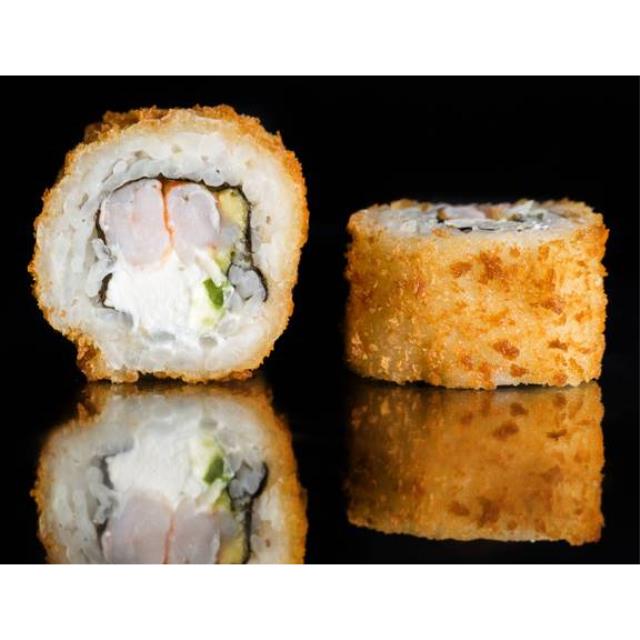 Por dentro surimi, queso crema y por fuera aguacate, encima una mezcla gratinada con queso filadelfia, camarón, cebollín y spicy sambal.