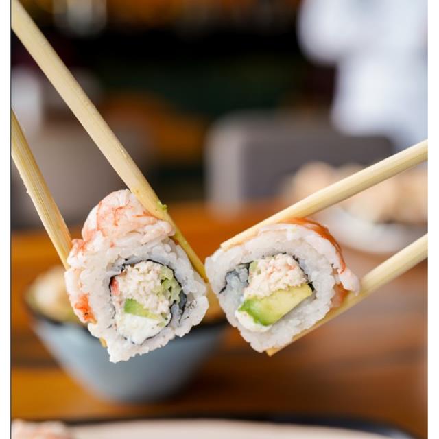 Por dentro queso crema, aguacate, pepino, camarón y surimi por fuera.