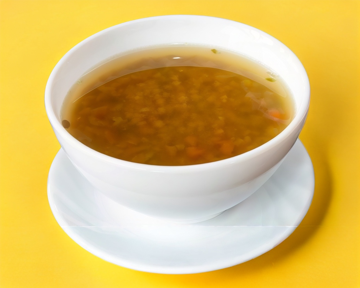 8 Oz. de consomé de pollo con verduras en cuadritos.