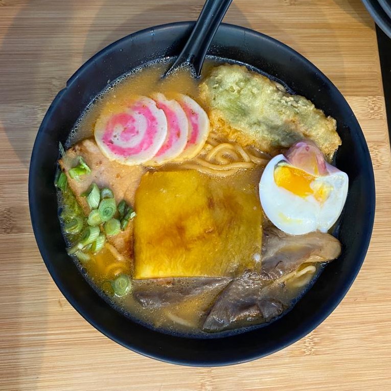 Ramen, Caldo con toque de curry, Tófu marinado y empanizado, Lomo o camaron, Frijol de soya, 2 germinados y Naruto cacahuate