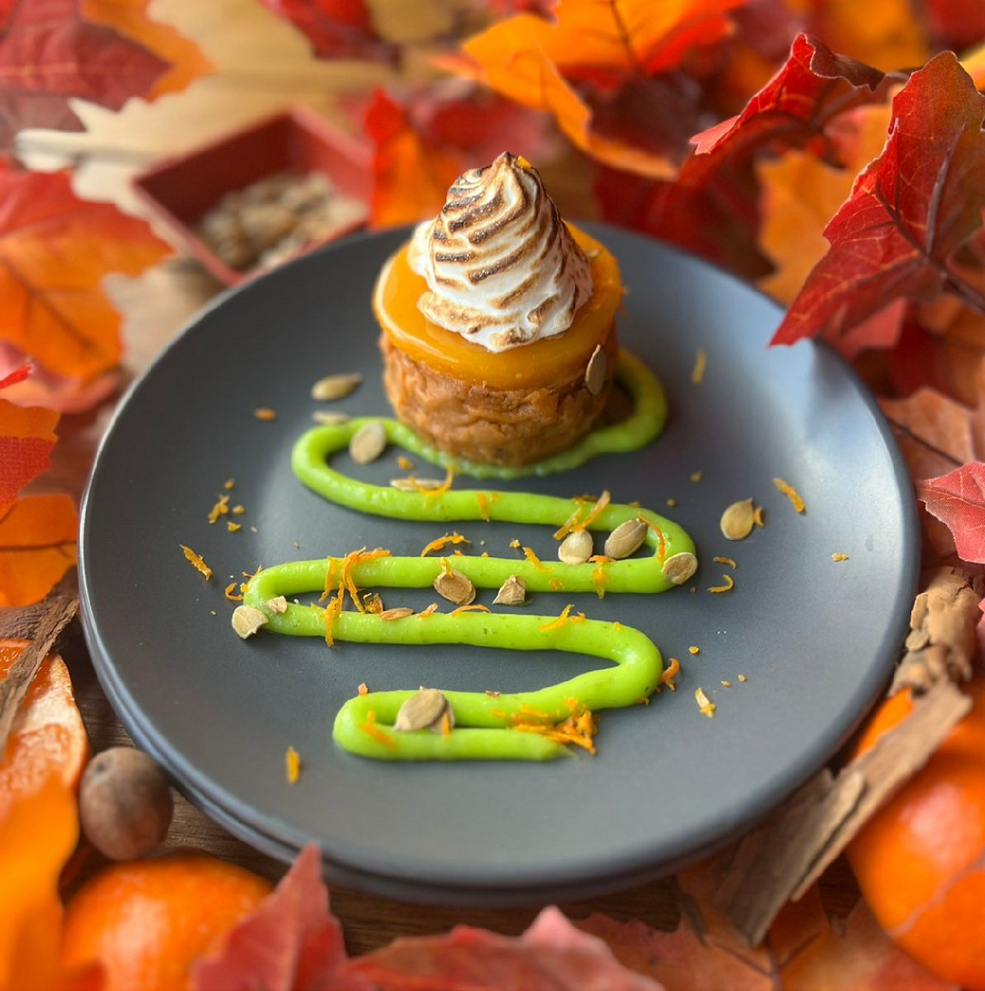 Pay de calabaza. Su base de galleta, encima lleva jelly de mandarina y merengue flameado, decorado con salsa citricas.