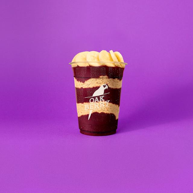 Smoothie a base de agua y açaí 100% natural de 500 ml, avena, plátano, nibs de cacao, miel, crema de cacahuate.