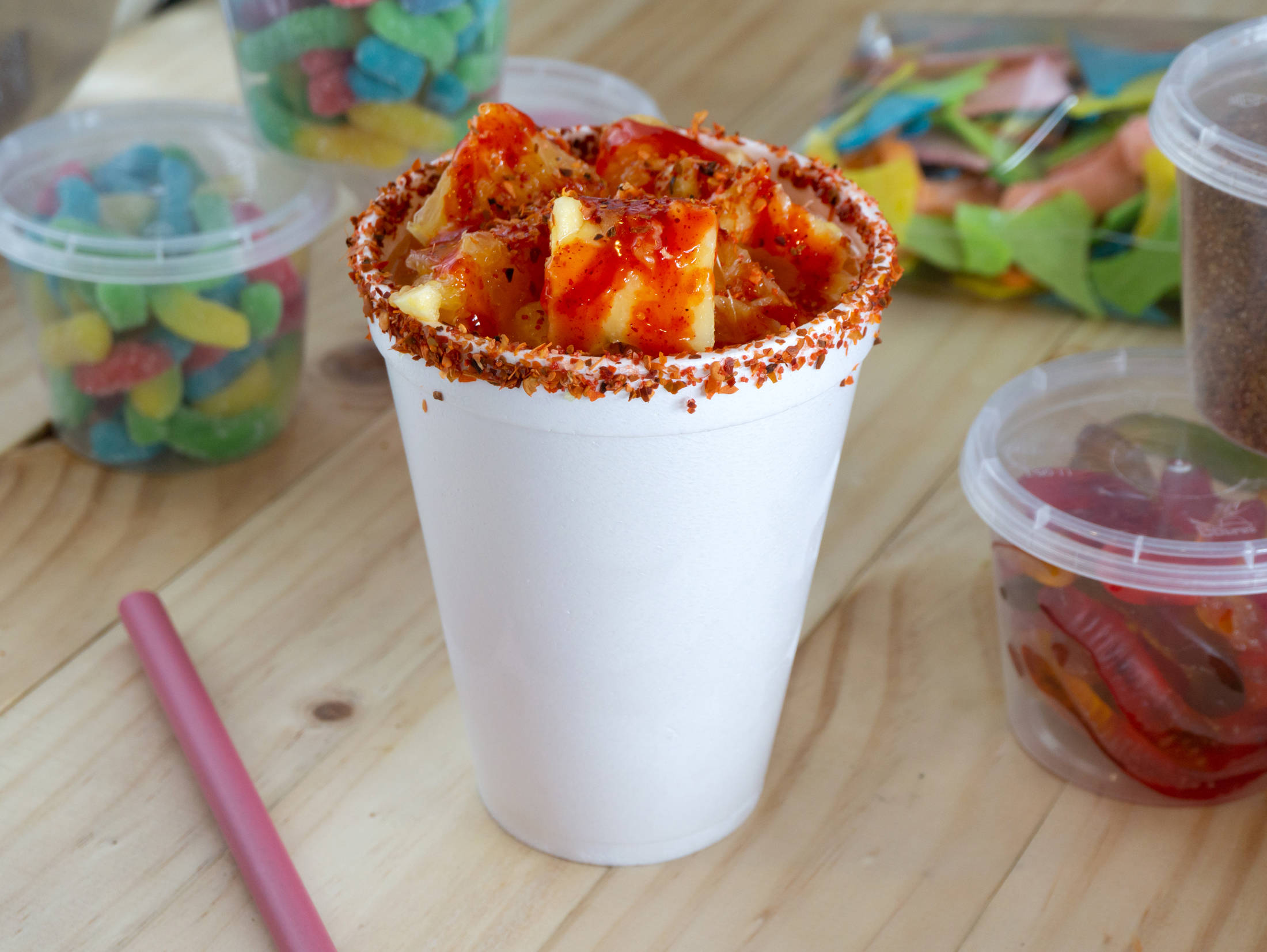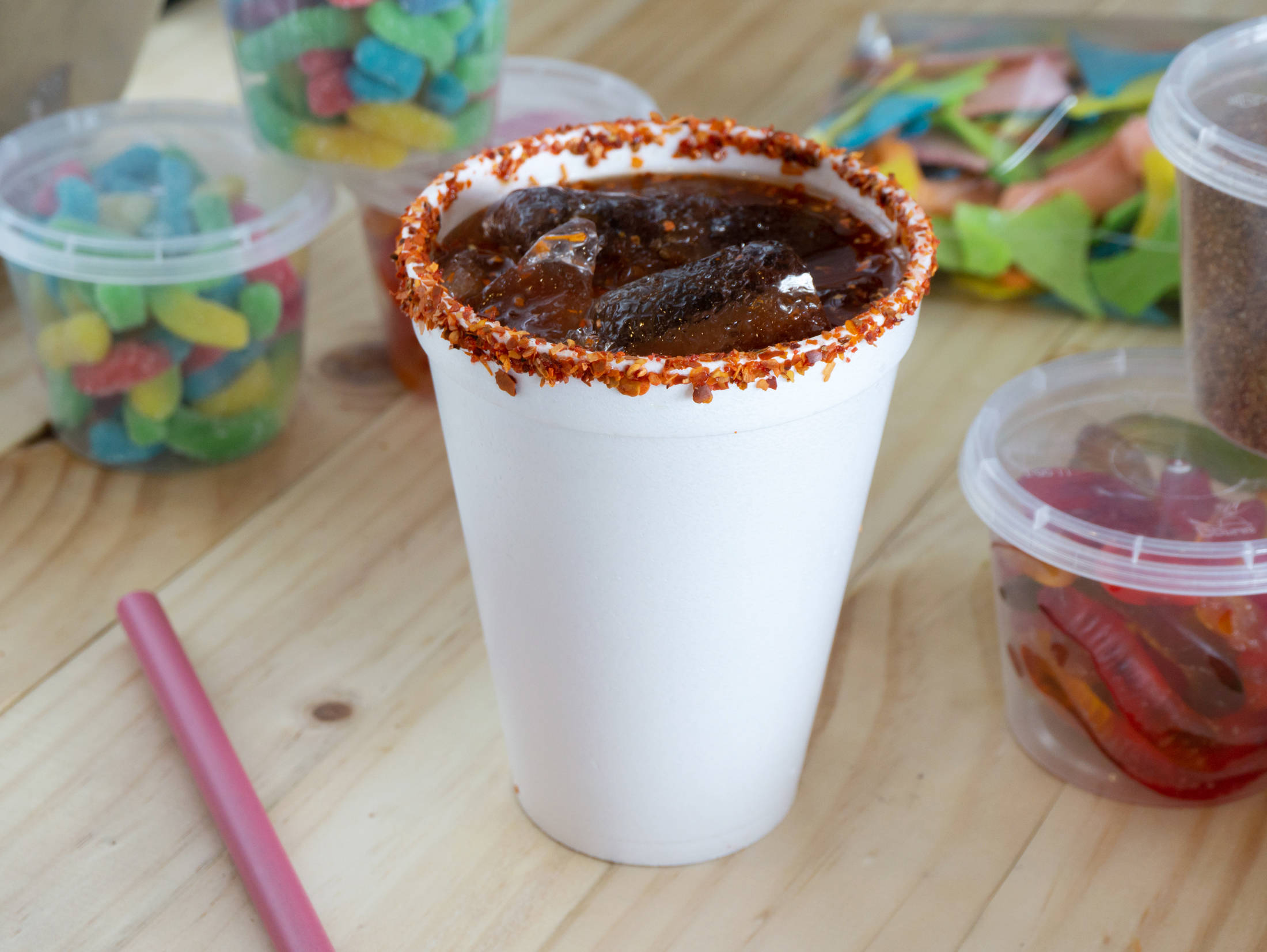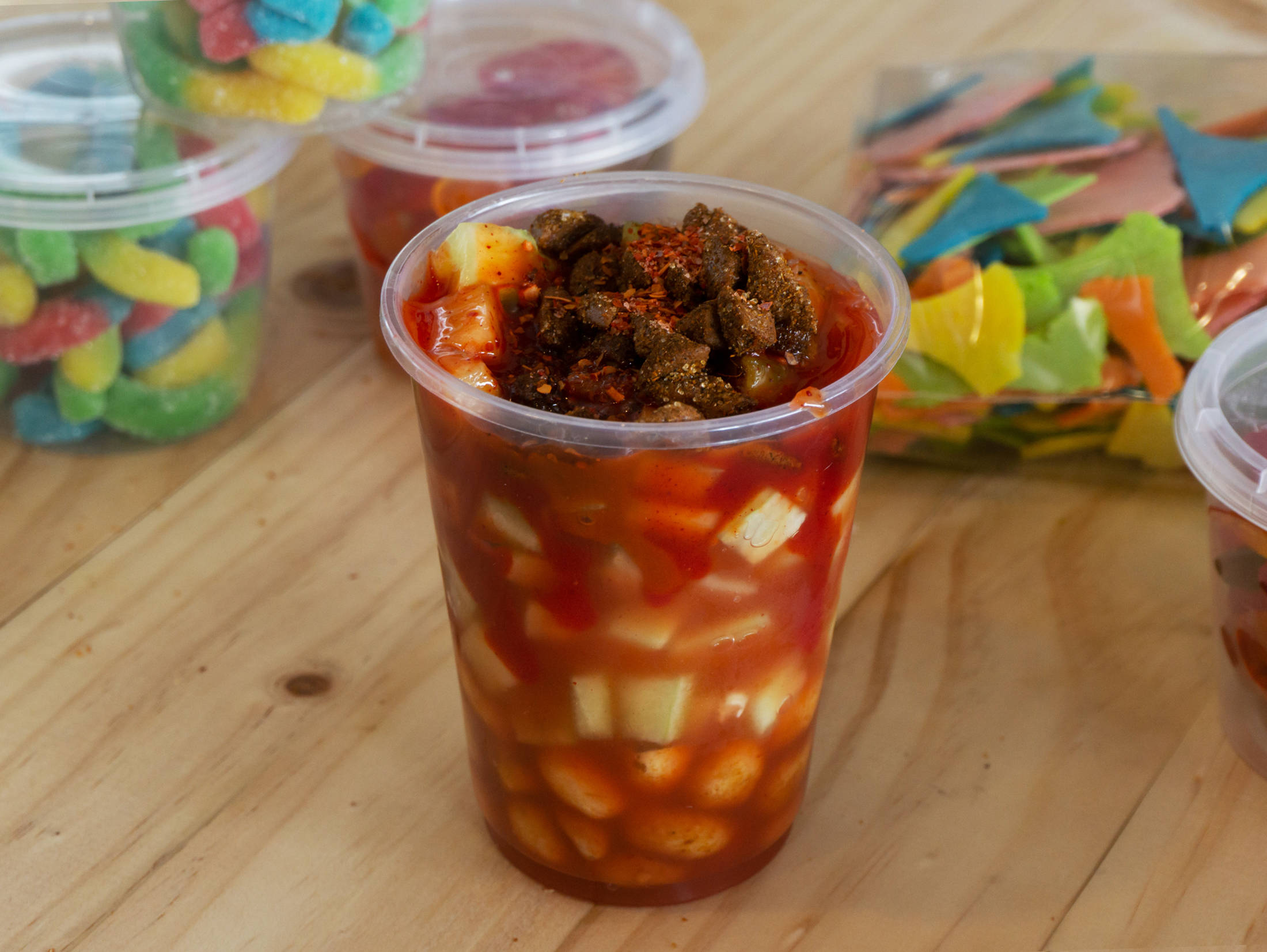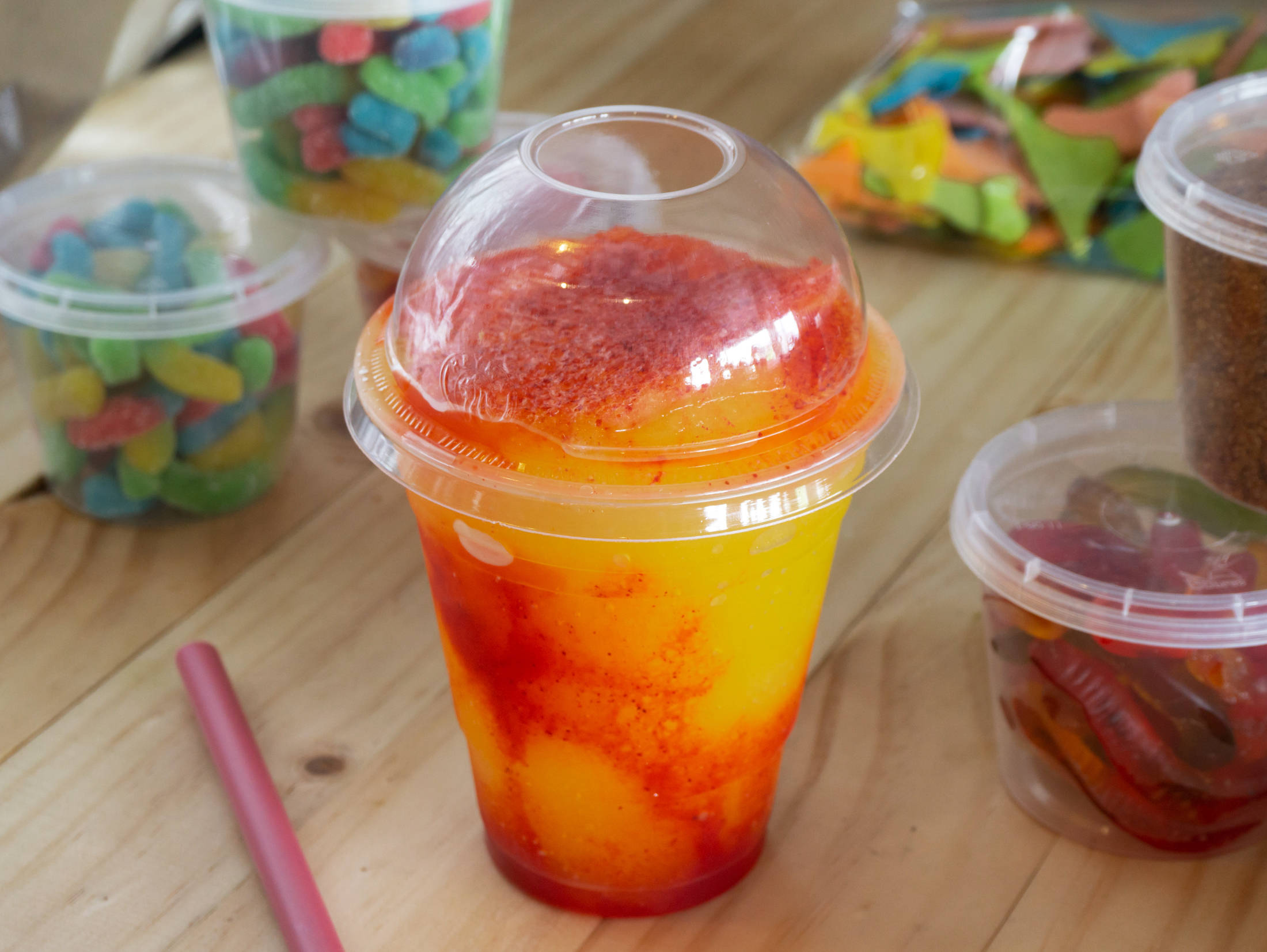 Frappé de chamoy cubierto con golos, miguelito y tajín.