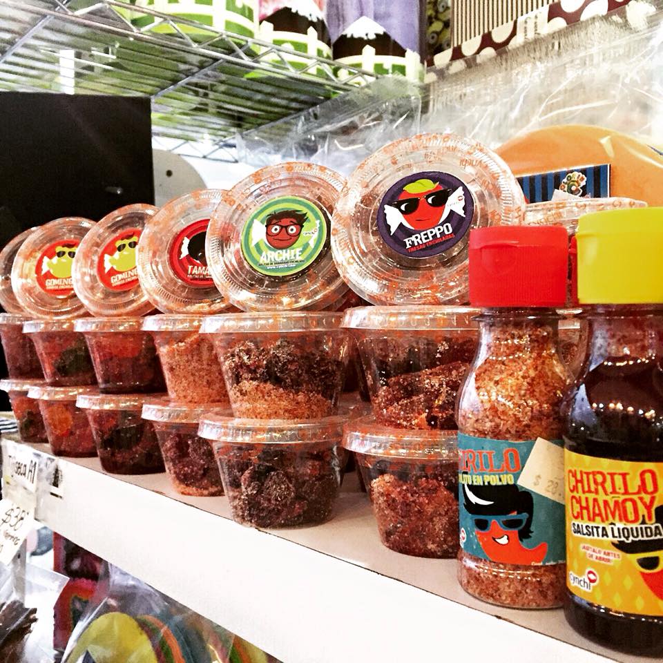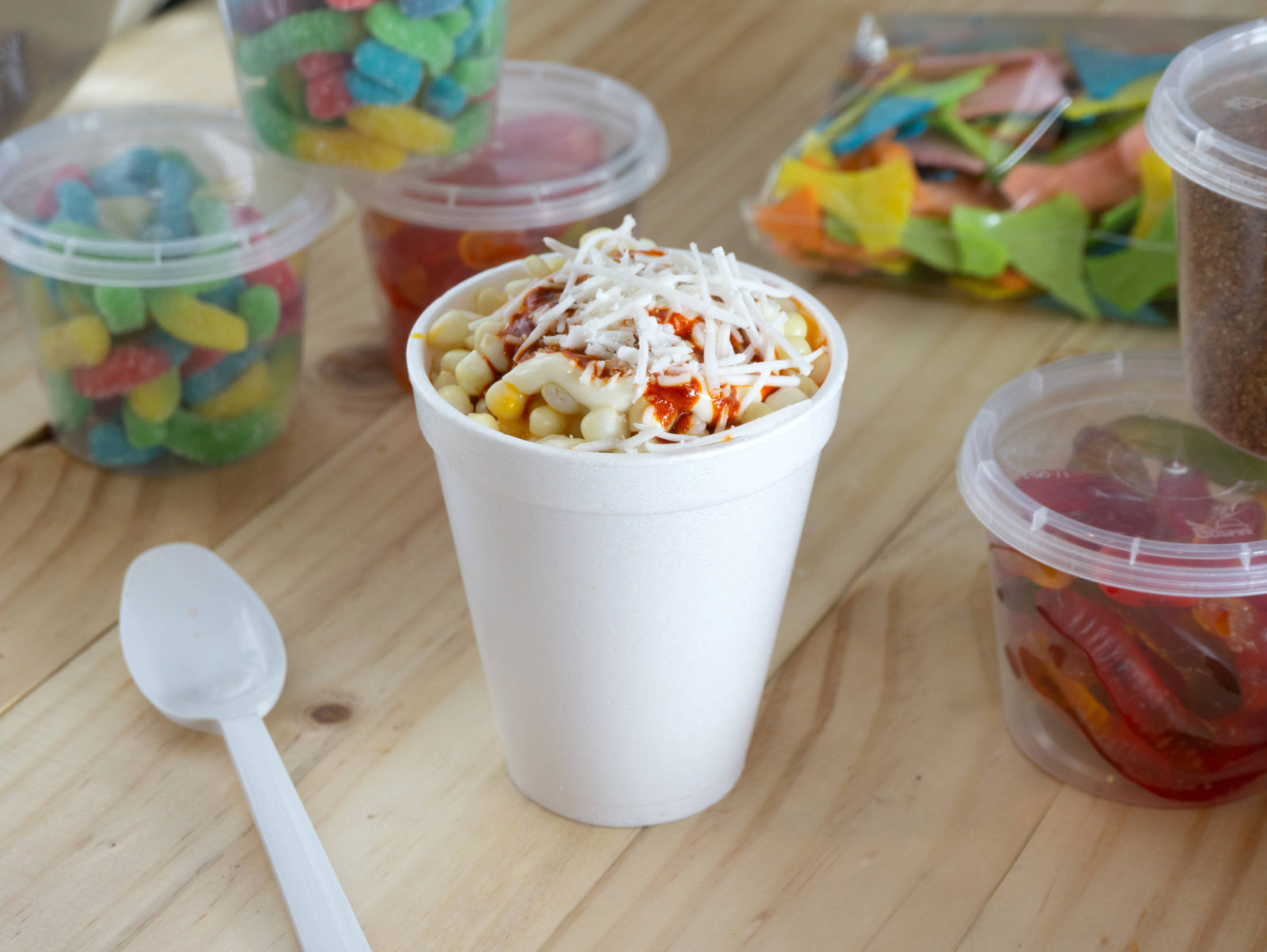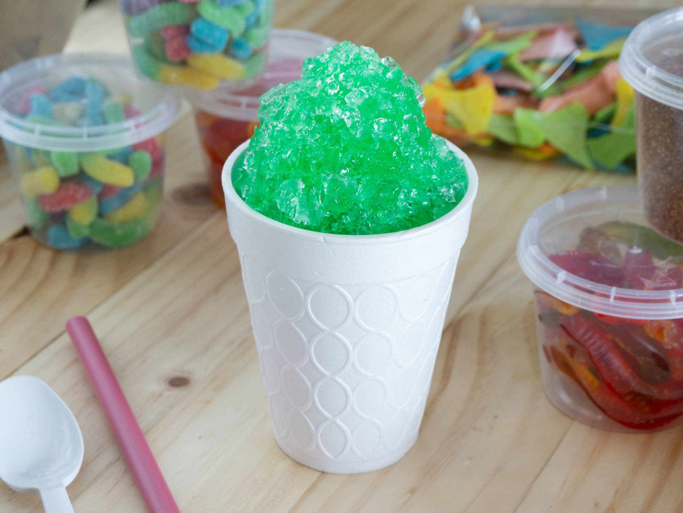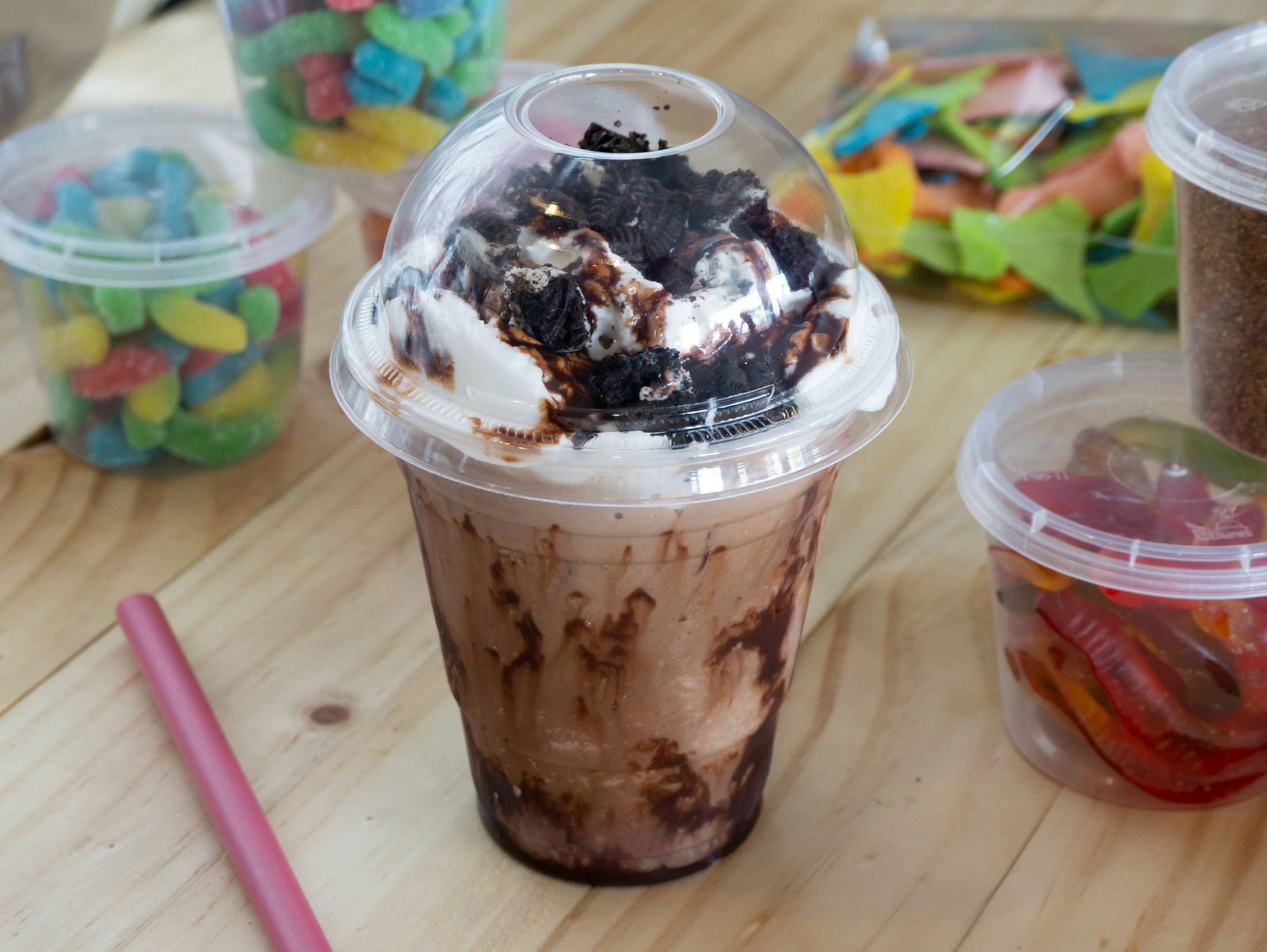 Frappé de chamoy cubierto con golos, miguelito y tajín.