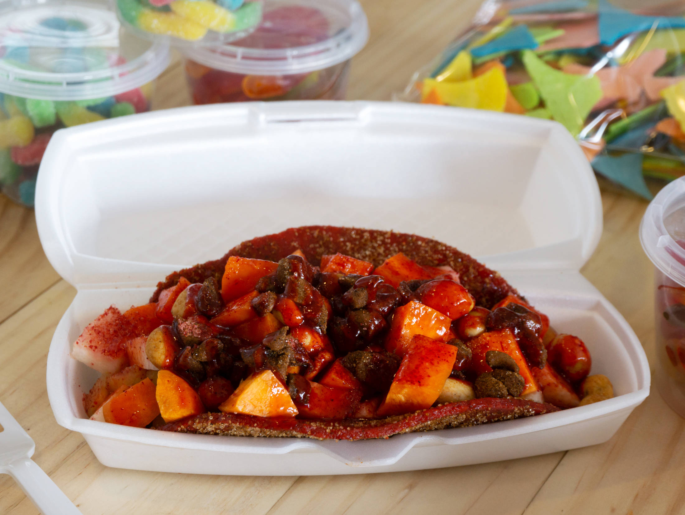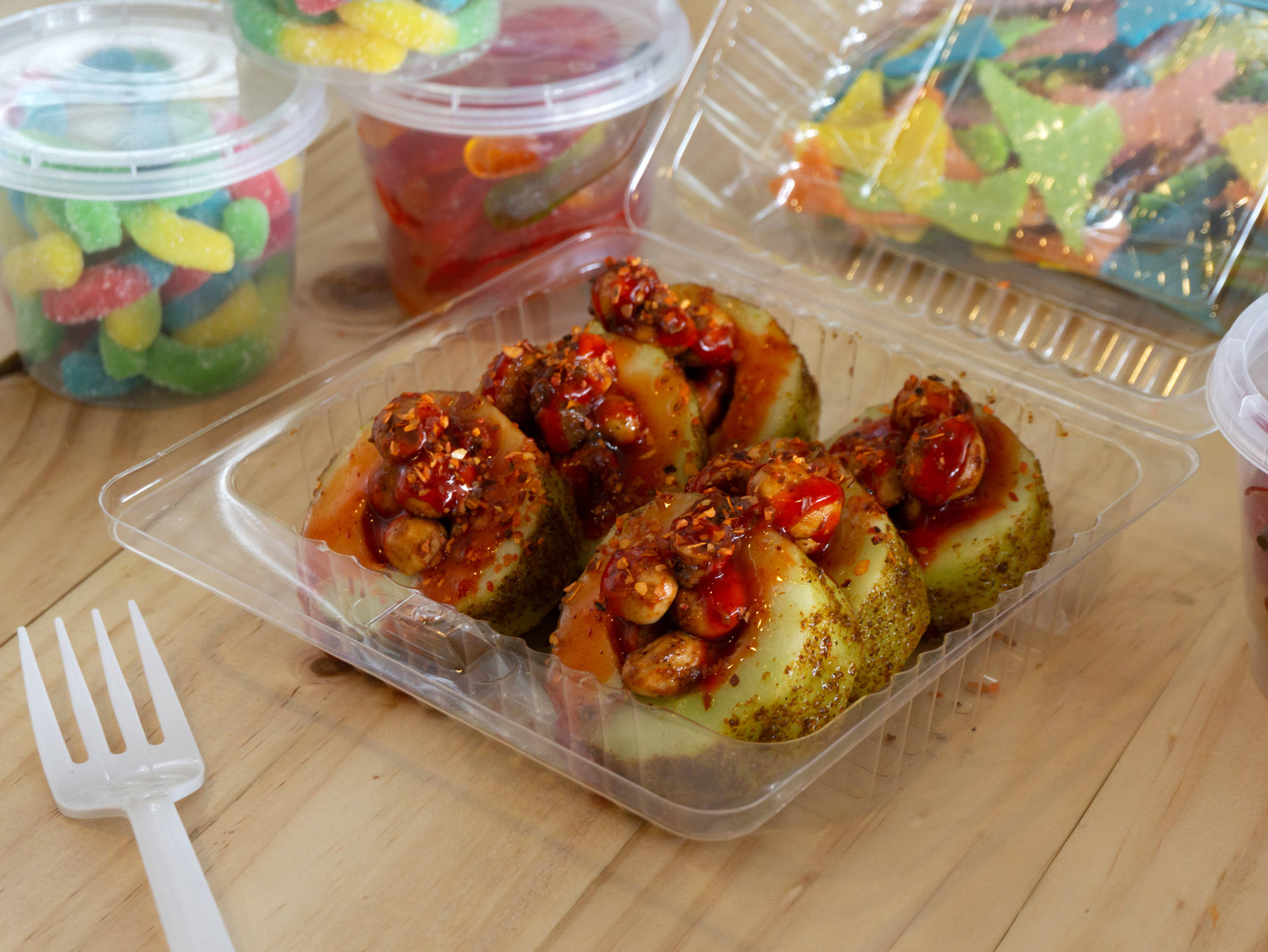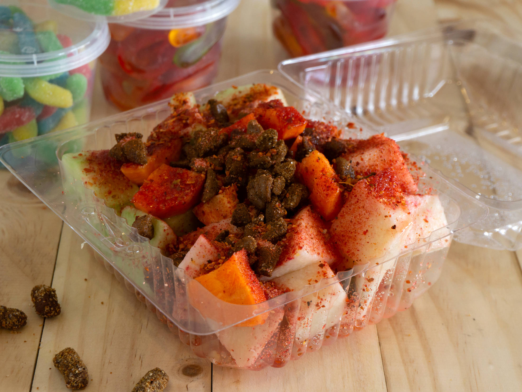 Delicioso taco de tamarindo, con pepino, jícama y zanahoria en trozo, cacahuates, golos y nuestra salsa de chamoy!