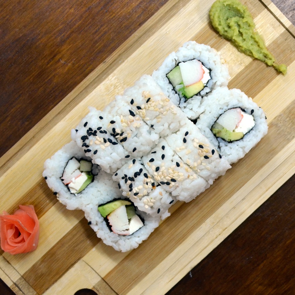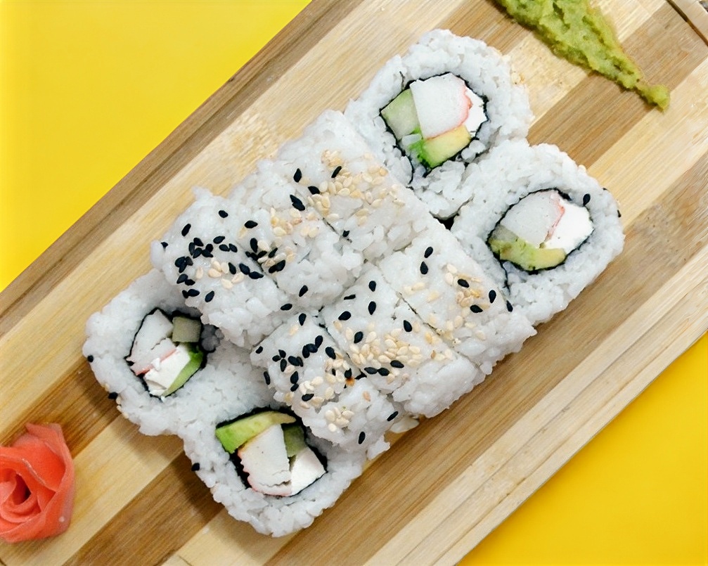 delicioso rollito relleno de aguacate, philadelphia, pepino, camaron, salmon fresco y surimi,alga por fuera y pasta tampico