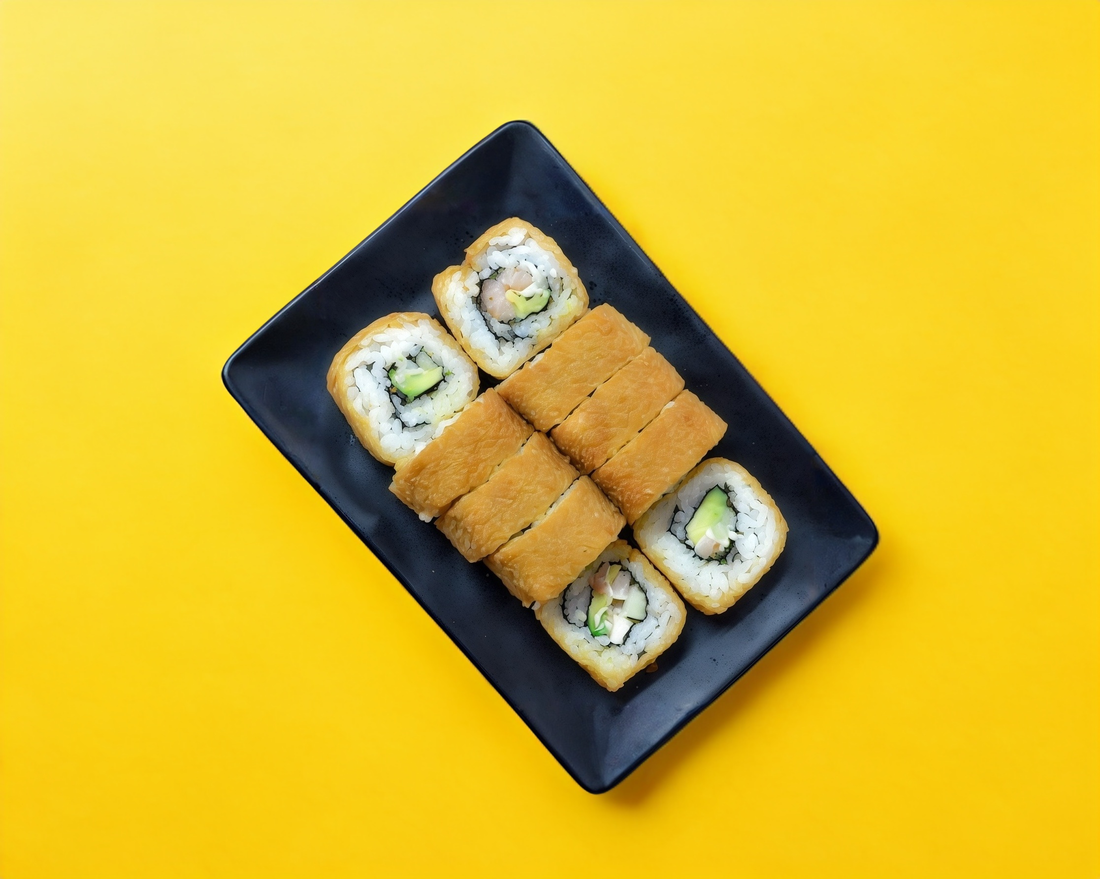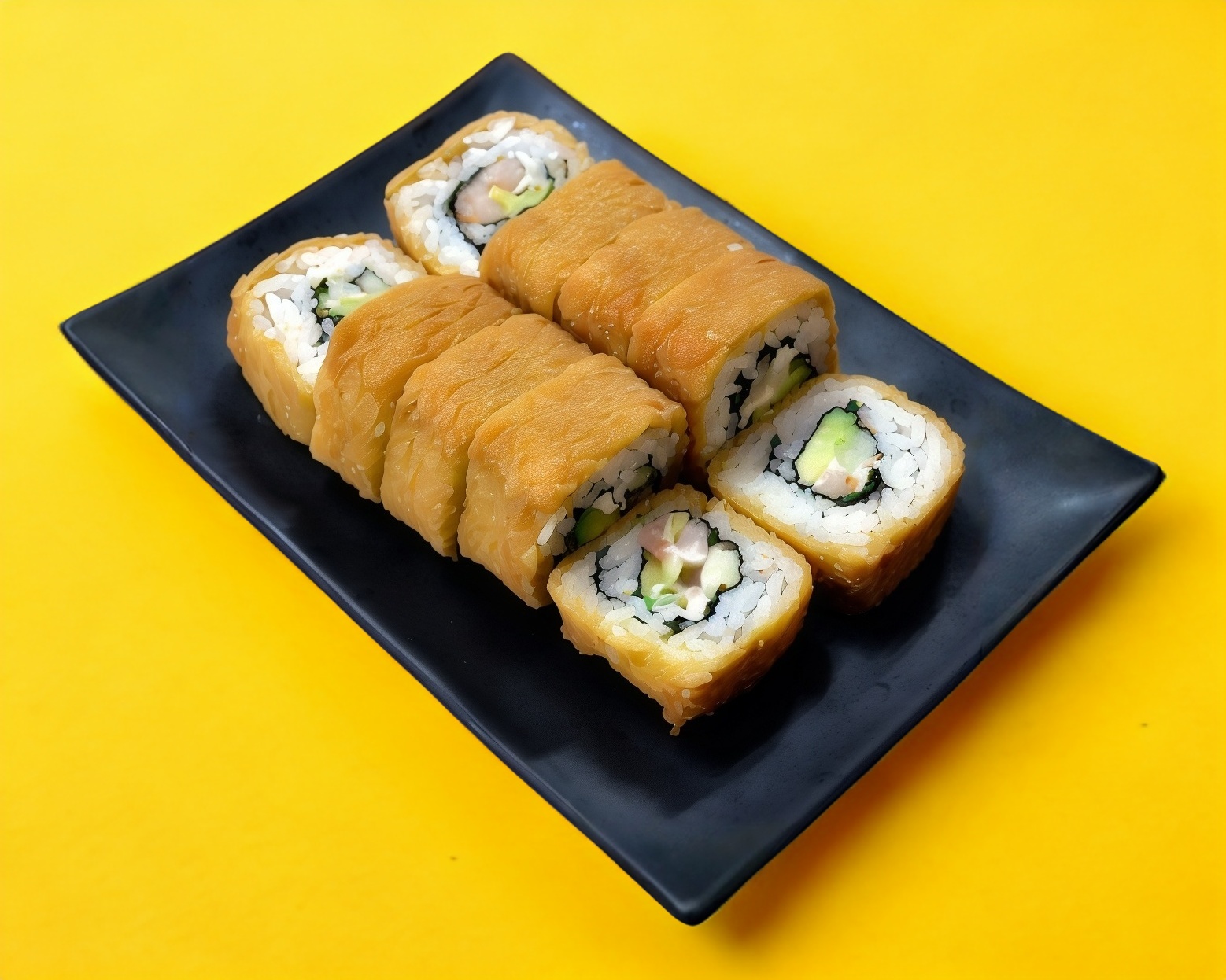 delicioso rollito relleno de aguacate, philadelphia, pepino y pasta tampico, por fuera empanizado o tempura