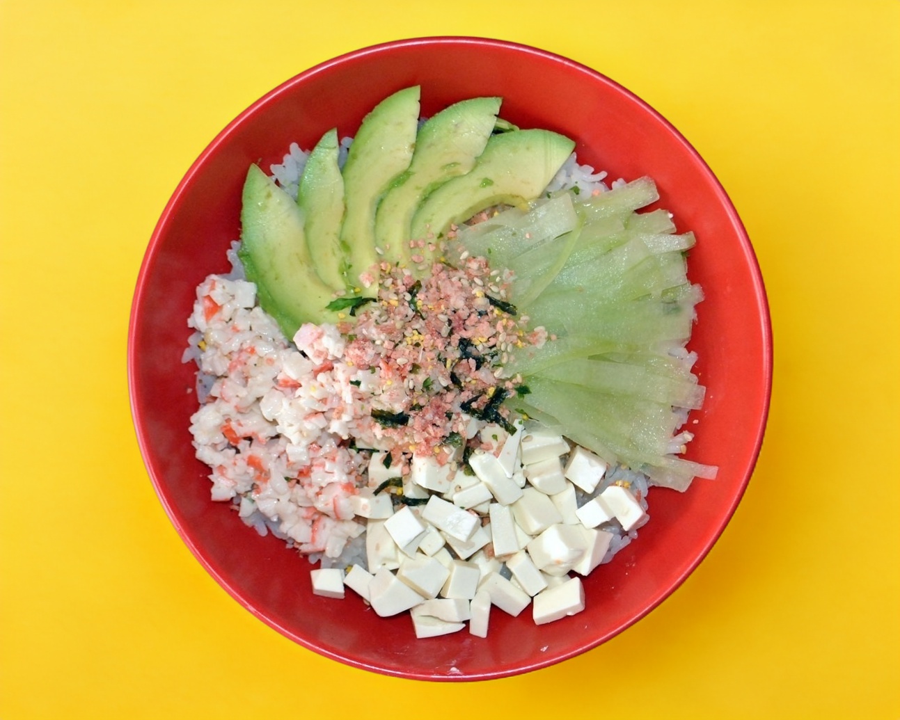 arroz al vapor coronado con philadelphia y pasta tampico o furikake