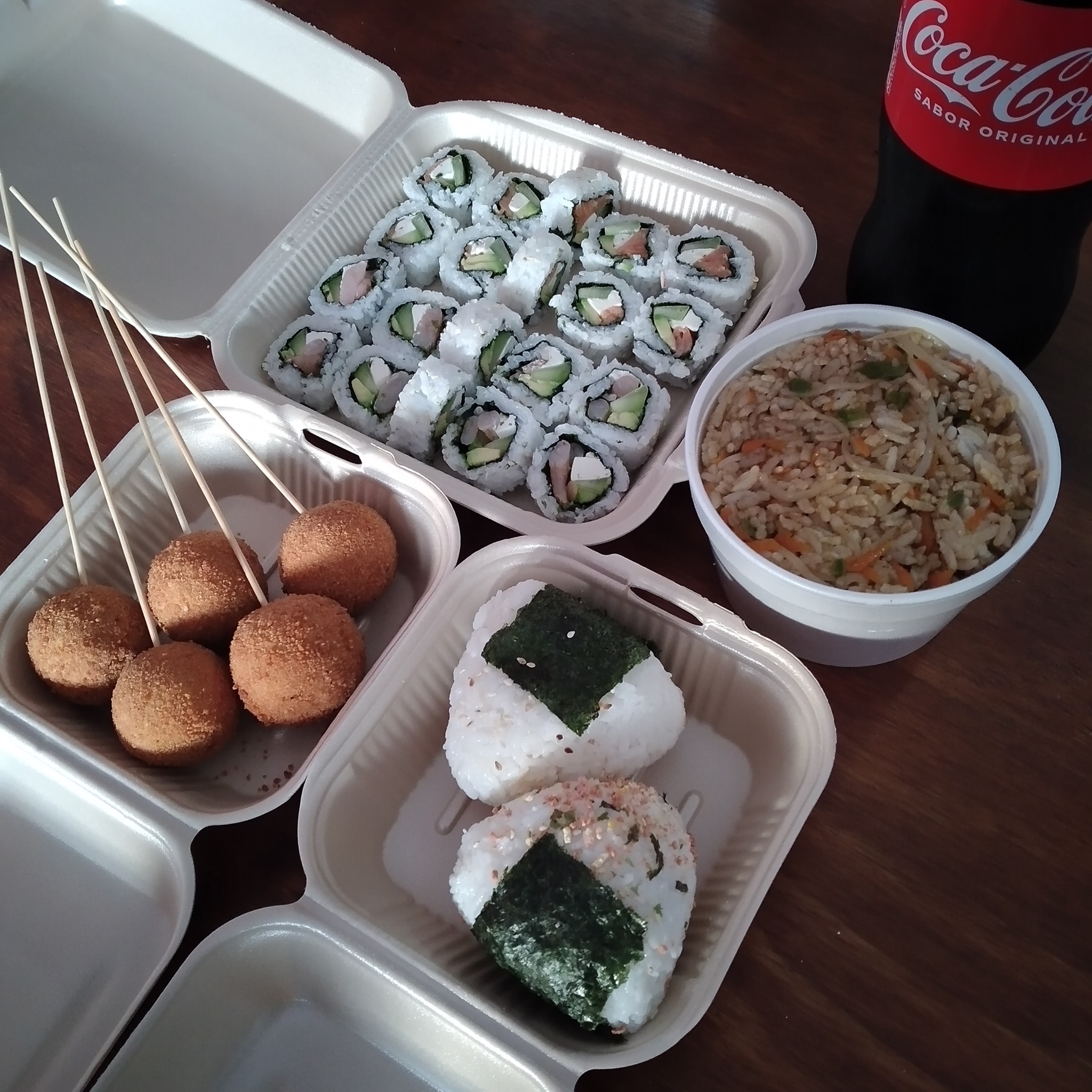 1 orden de kushiagues de salmon, 2 oniguiris (1 de salmon con furikake y otro de camaron con philadelphia), 1 yakimeshi mixto completo, 1 rollo california y 1 rollo ebi frios, 1 cocacola de 1 litro