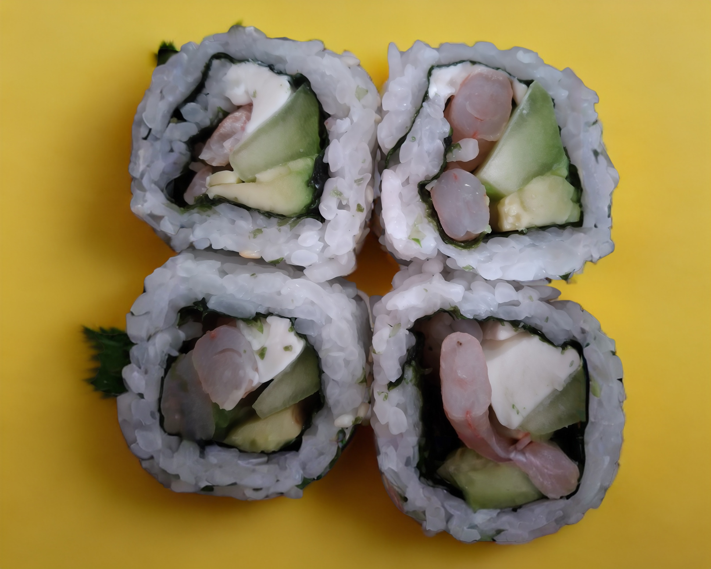 delicioso rollito relleno de aguacate, philadelphia, pepino y camaron