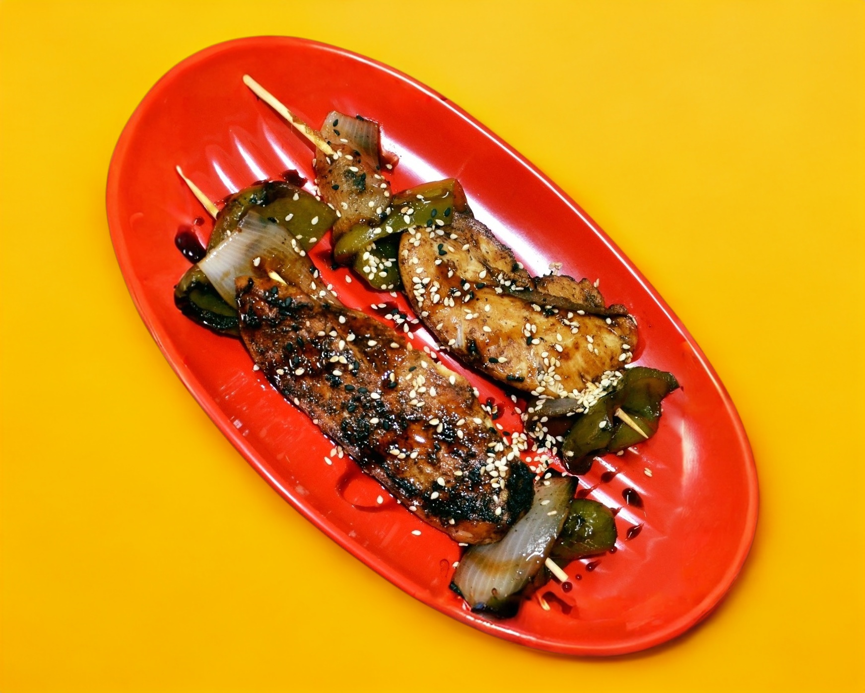 deliciosas brochetas a la plancha con un toque de ajonjoli.