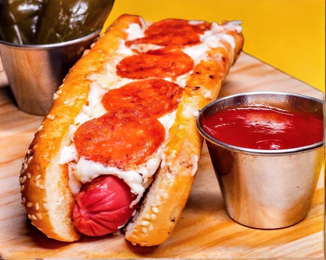 Pan jumbo, salchicha de pavo jumbo sobre cama de salsa de tomate con especies, cubierto de queso y peperoni