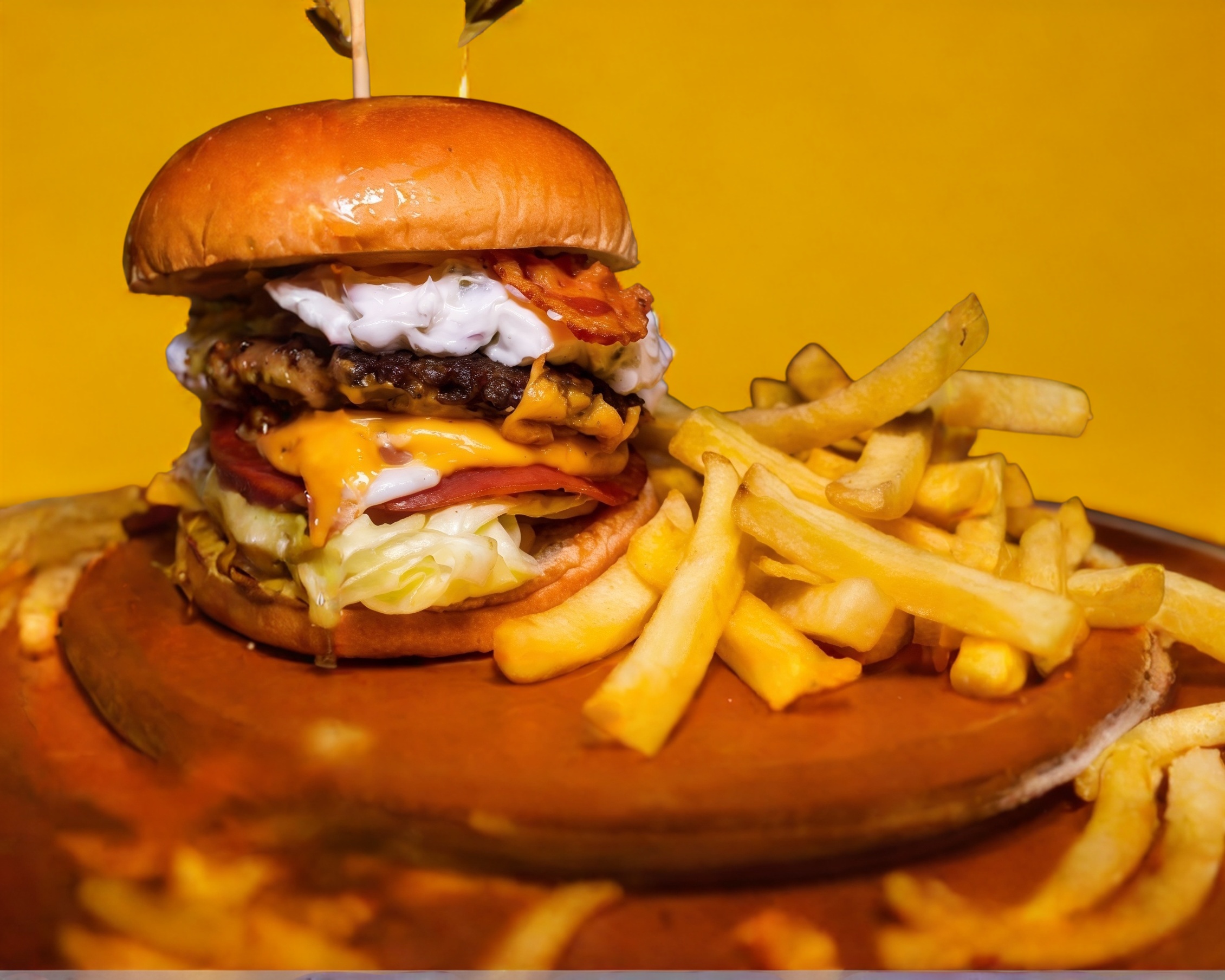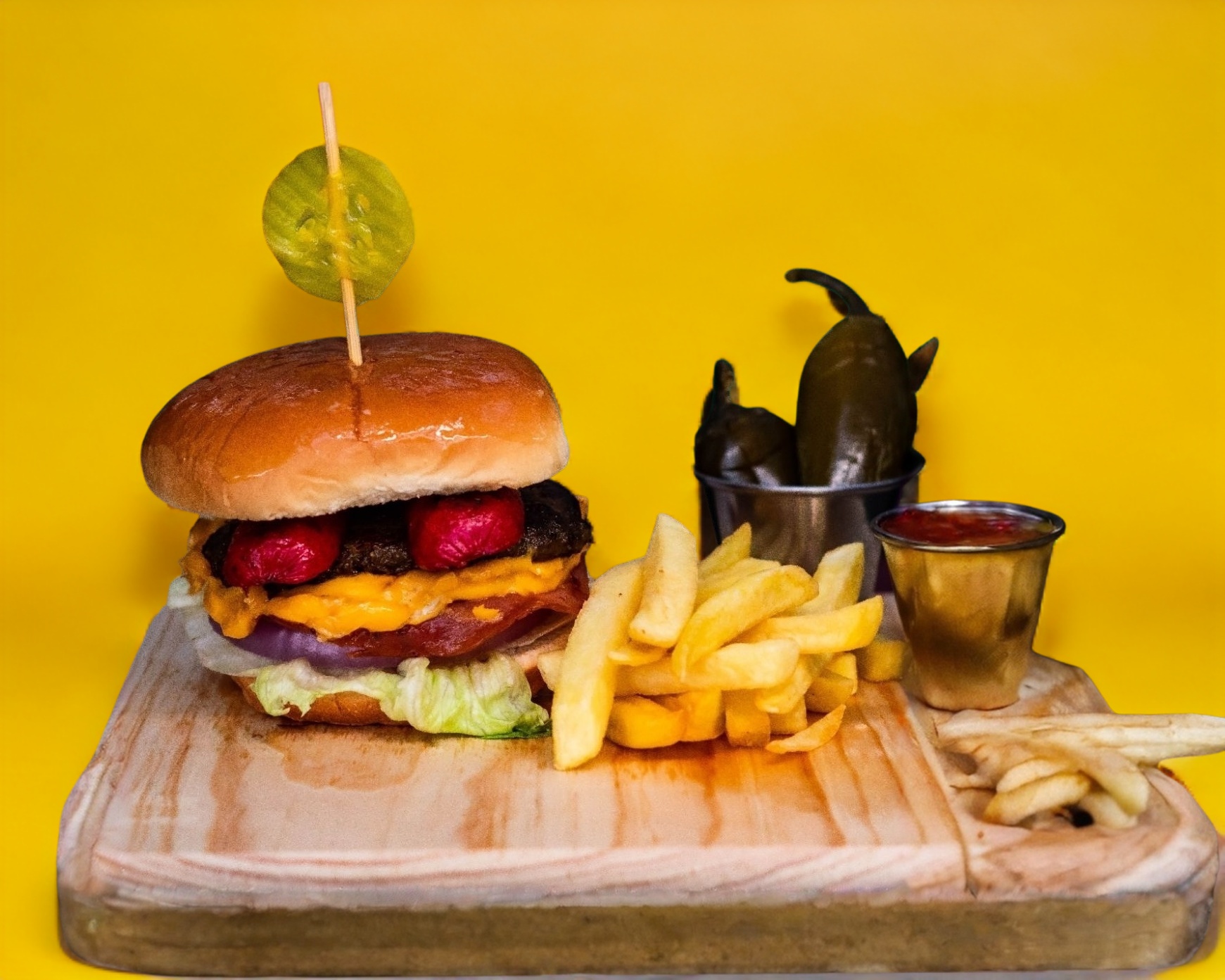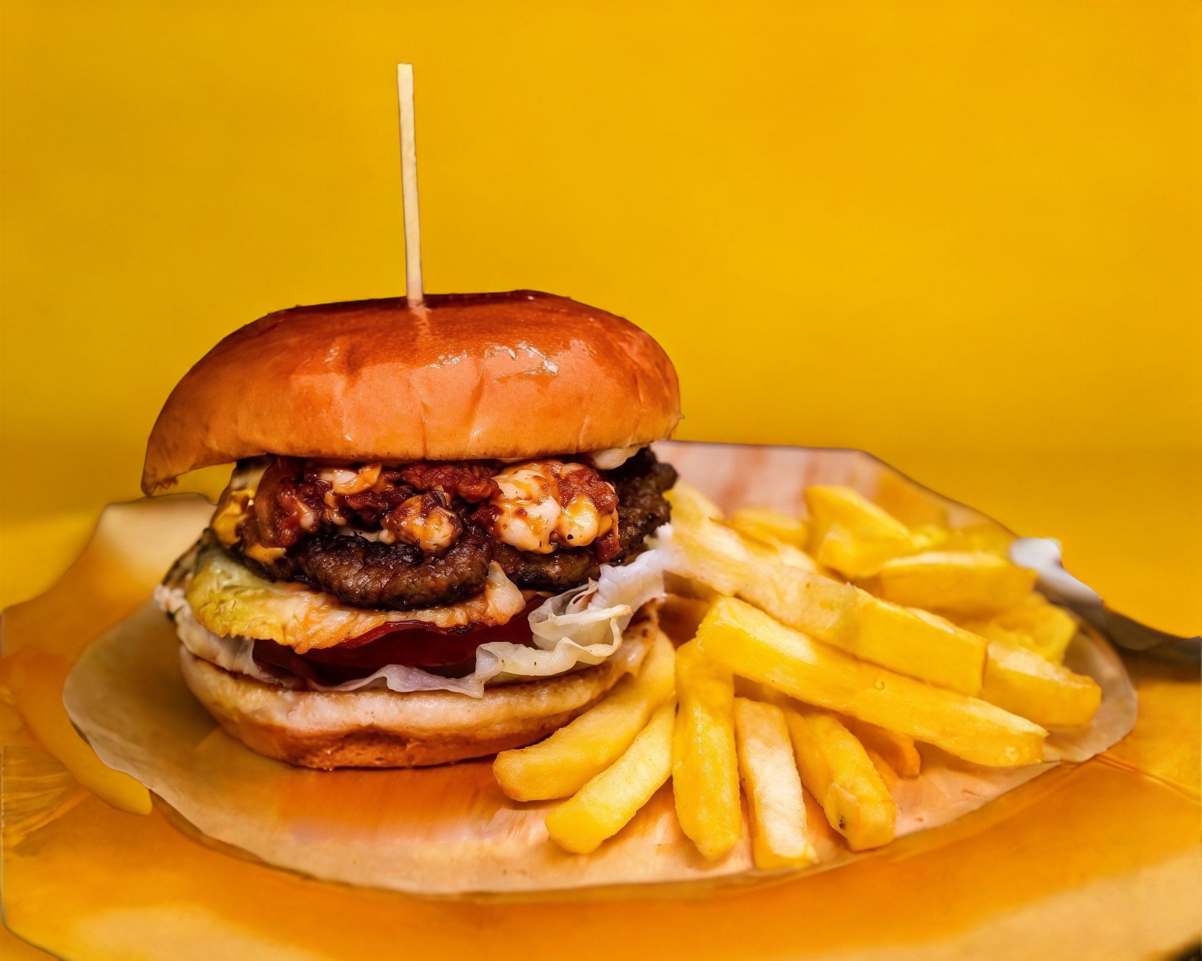 Deliciosa carne recien preparada, jamon, queso americano y oaxaca, abundante mezcla de guacamole con pico de gallo, tocino crujiente, lechuga, tomate y cebolla