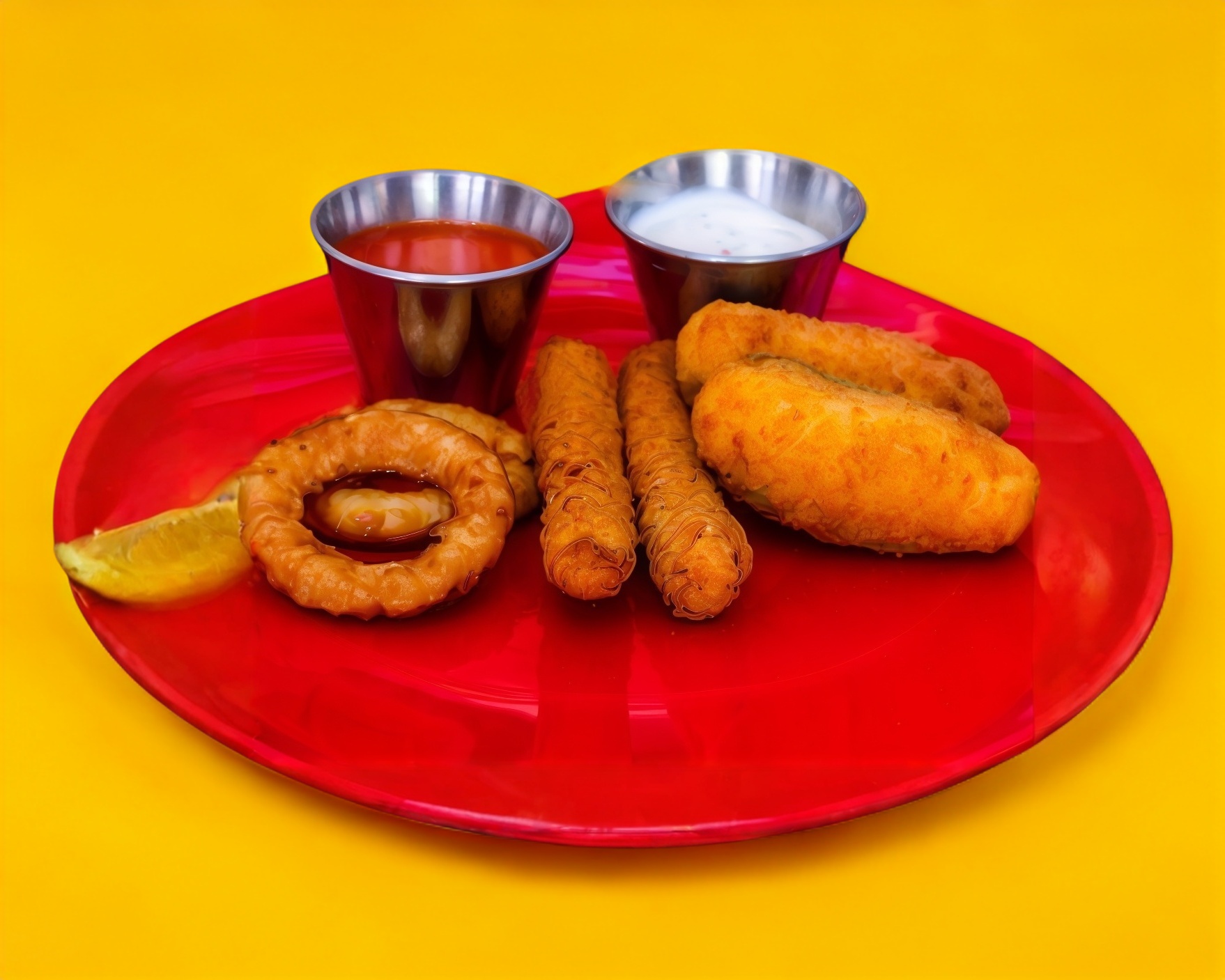 2 dedos de queso, 2 jalapeños poppers y 2 aros de cebolla