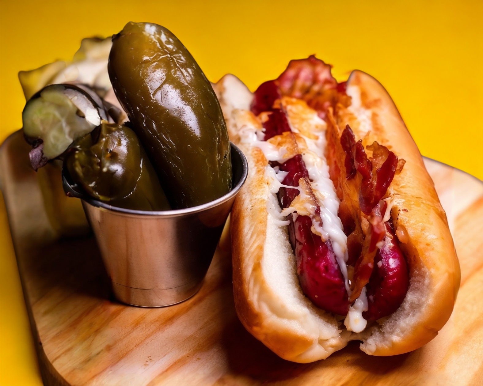 Pan jumbo, salchicha polaca con queso jumbo, 3 salamis, tocino crujiente y aderezos
