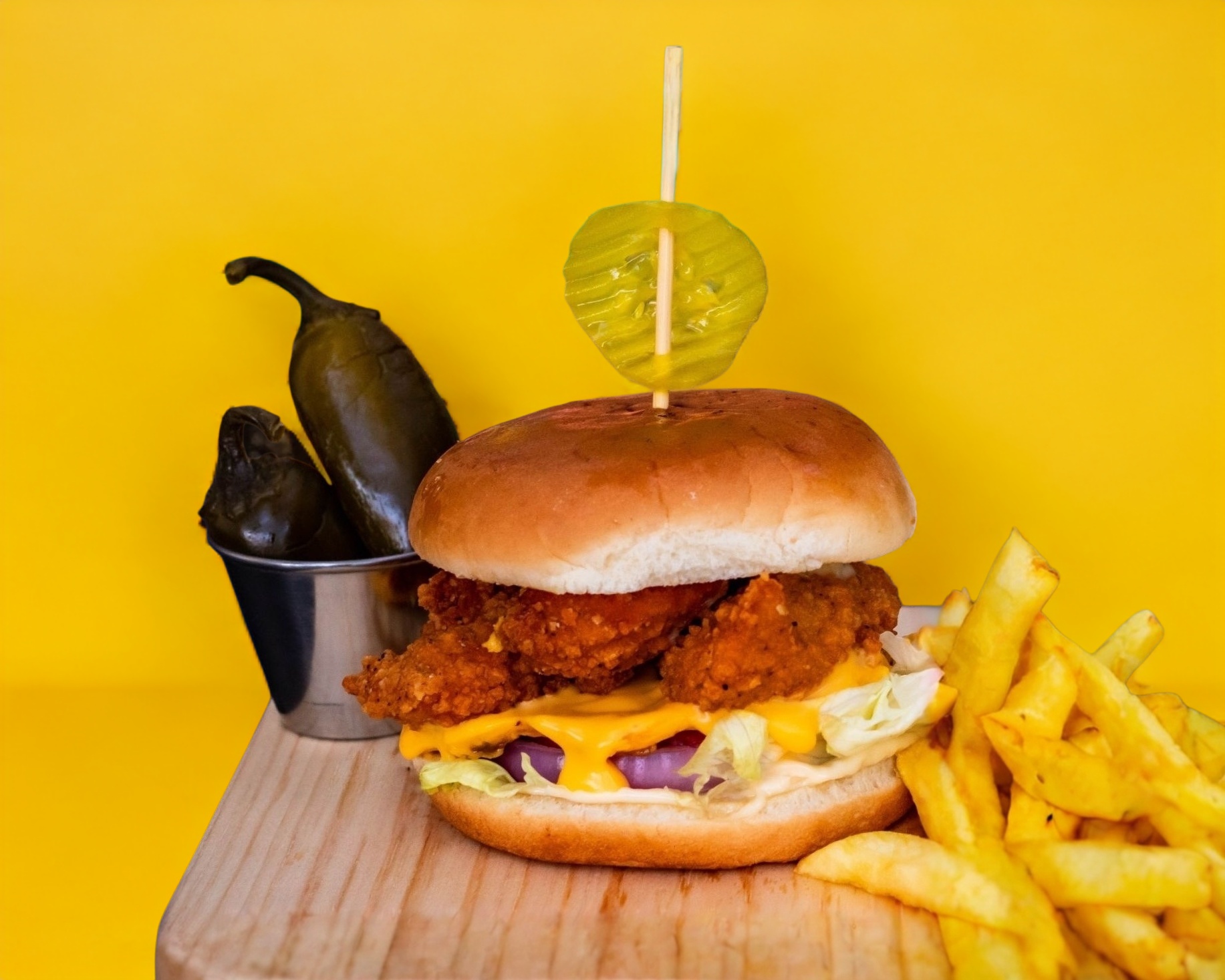 3 tiras de crujiente pechuga de pollo empanizada y sazonada con especies, queso americano, pepinillos, mayonesa, lechuga, tomate y cebolla