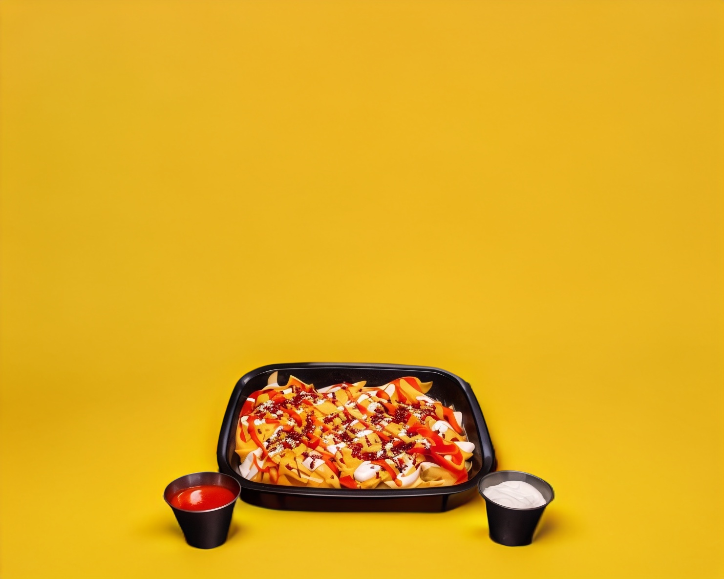 400 gramos charola de papas fritas bañadas en queso chédar, aderezo ranch y salsa búfalo
