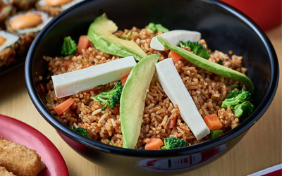 Arroz frito decorado con queso crema y aguacate. Tamaño personal (250 gramos)