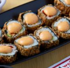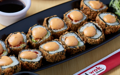 Arroz frito, camarón, queso crema y aguacate; capeado y bañado en salsa de anguila. -Rollo Caliente. Incluye un solo rollo.