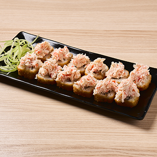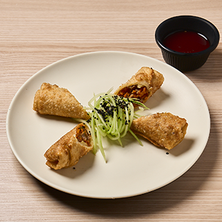Pasta de surimi, pepino y aguacate por dentro, ajonjolí, dorado por fuera.