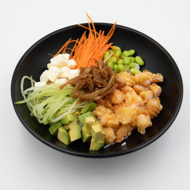 Arroz frito acompañado de trozos de chicharrón dorado, con aguacate y surimi capeados como topping, acompañado de nuestro aderezo serrano - limón.