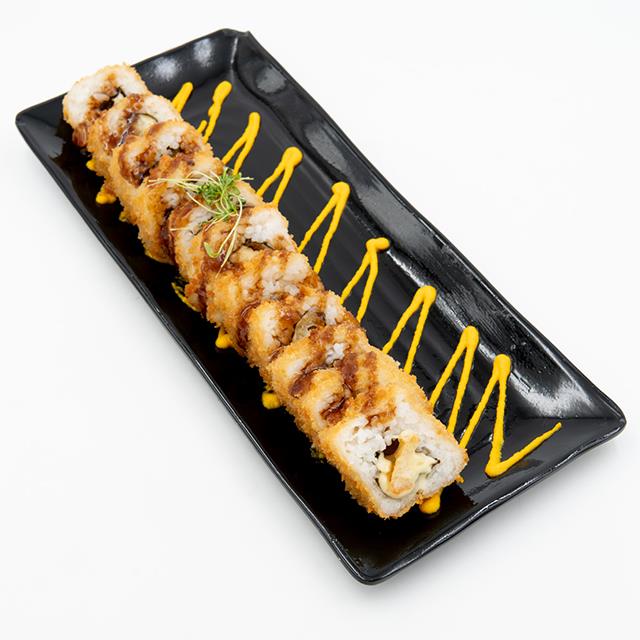 Camarón, aguacate y queso crema, empanizado y bañado en salsa de anguila.