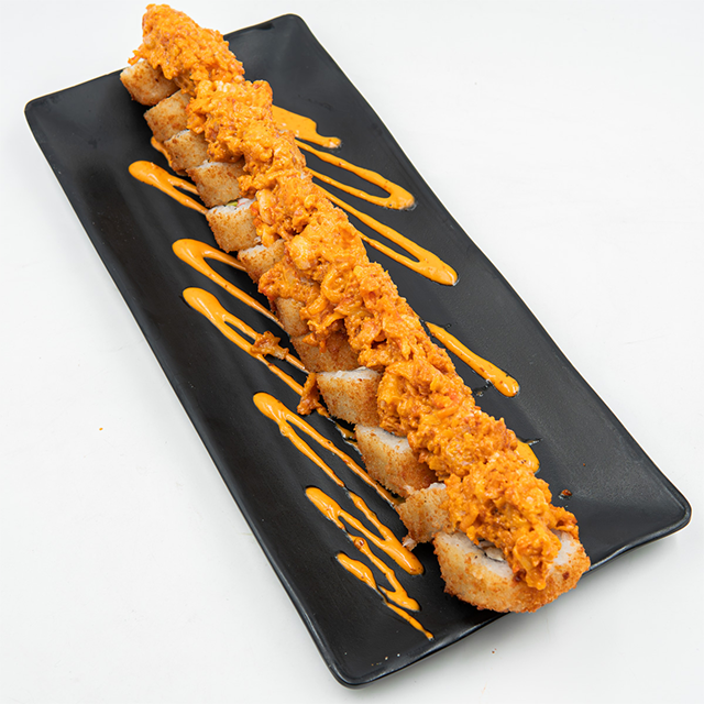 Salmón, queso crema y aguacate por dentro; por fuera, masago y una torre de surimi frito mezclado con aderezo roca y decorado con cebollín. Incluye un solo rollo.