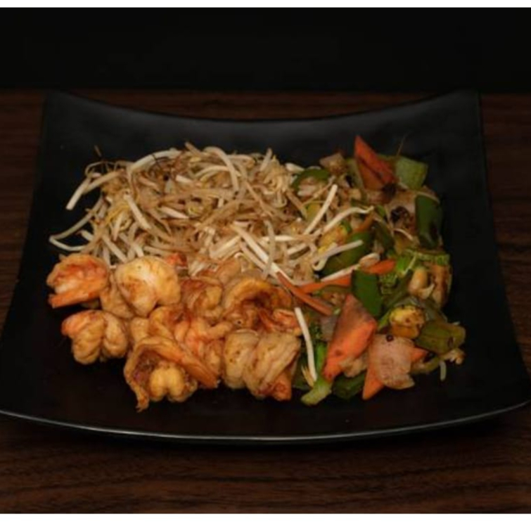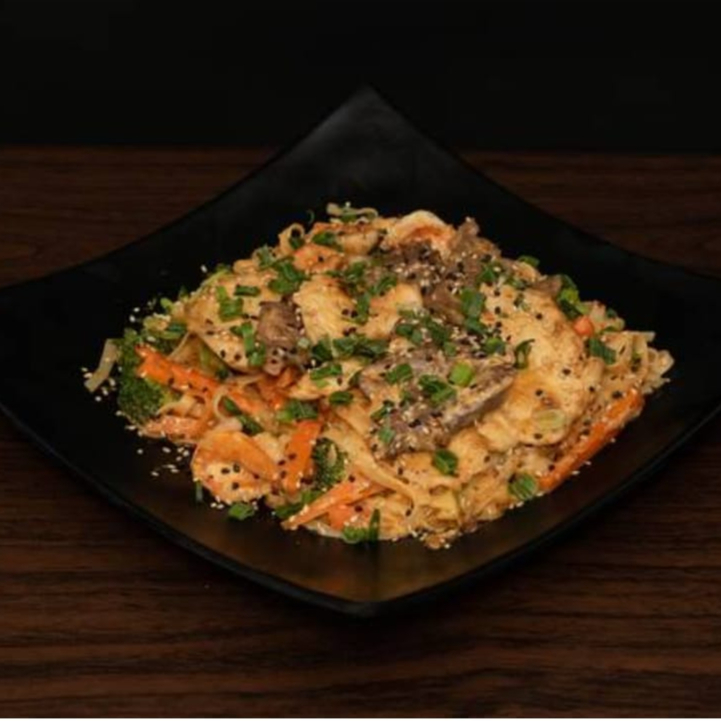 pasta japonesa con pollo camaron res verduras cebollin ajonjoli y sazonada con salsa pantai