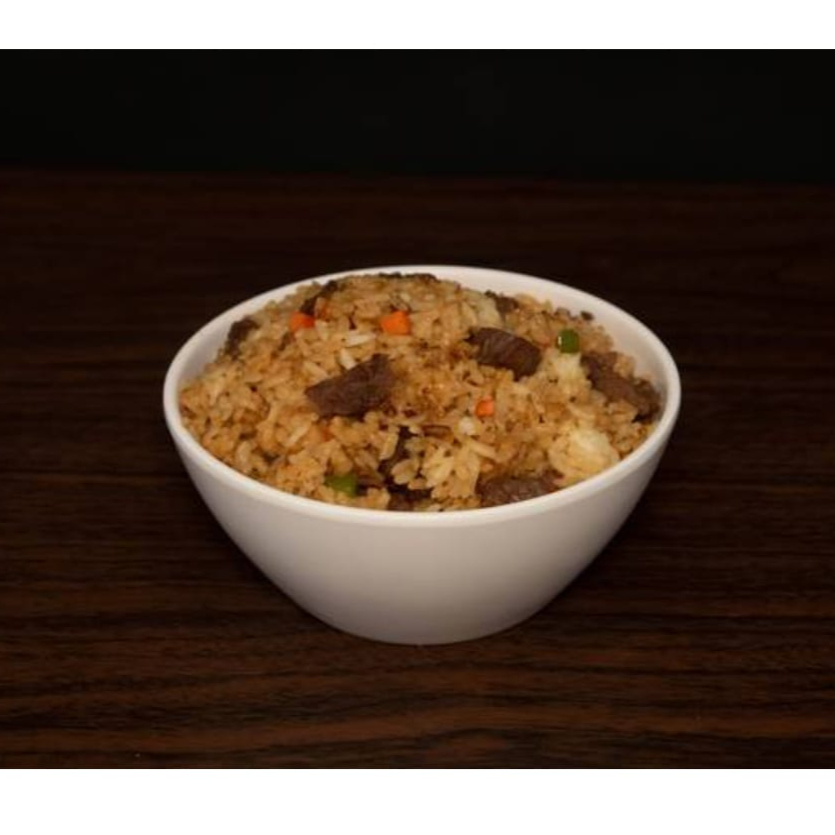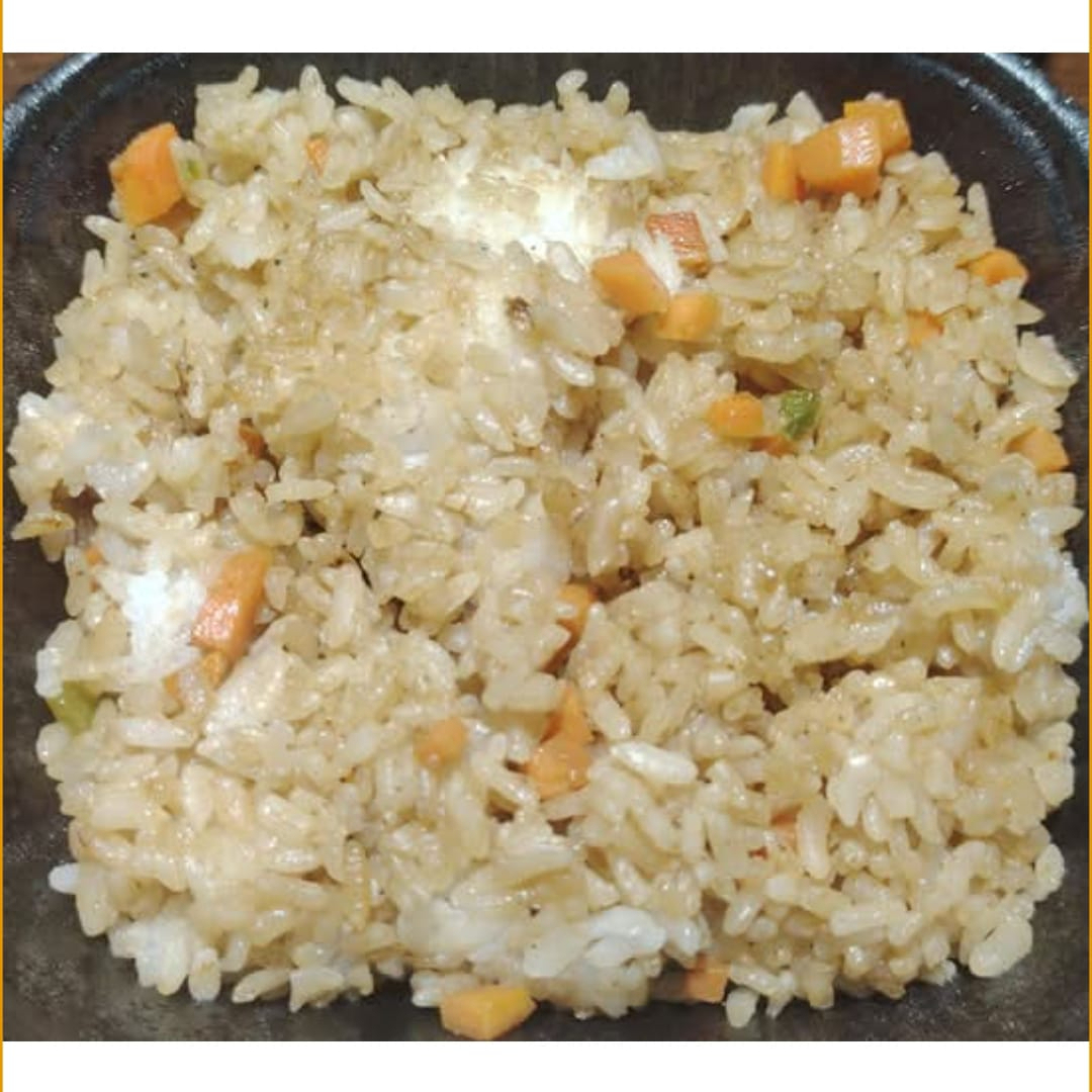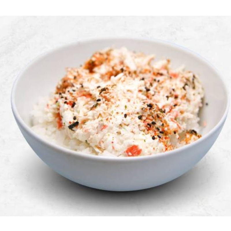arroz al vapor con pasta de cangrejo queso crema y furikake.