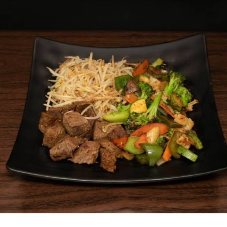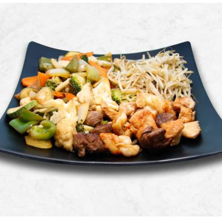 platillo de carne de res pollo y camaron a la plancha acompañado de verduras al vapor y germinado de soya