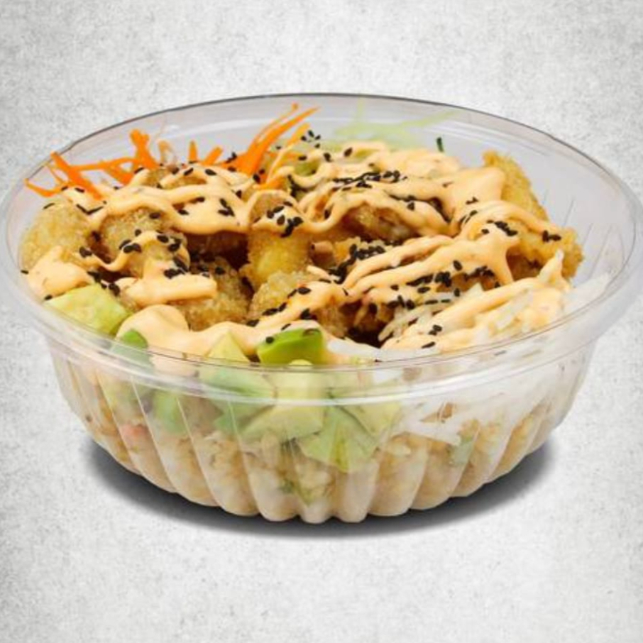 base de arroz frito proteina pollo empanizado camarones roca topings zanahoria pepino aguacate piña jicama aderezos spicy y anguila