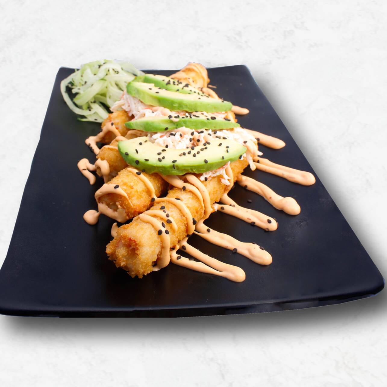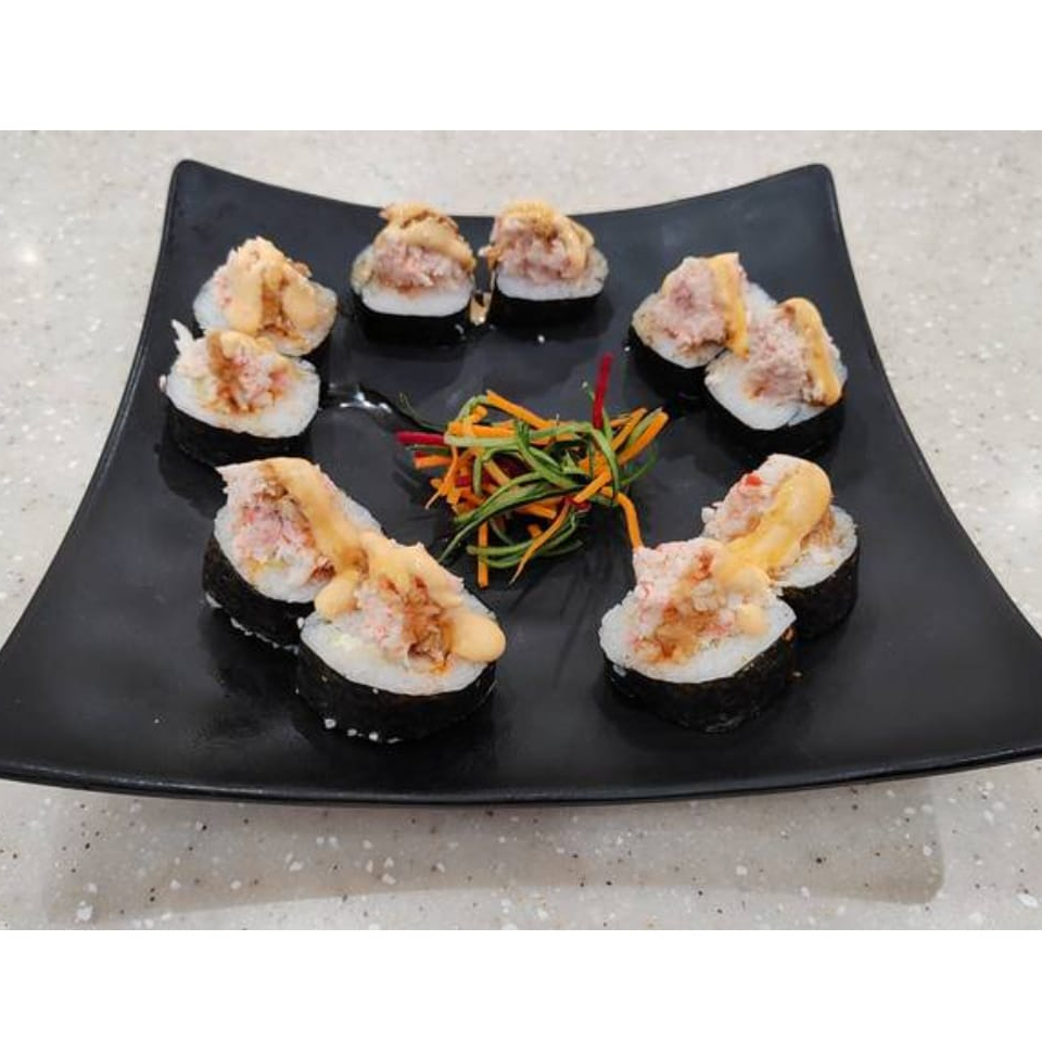 Surimi empanizado, relleno de queso crema, pasta tampico, encima aguacate, bañado de salsa spicy y salsa de anguila.