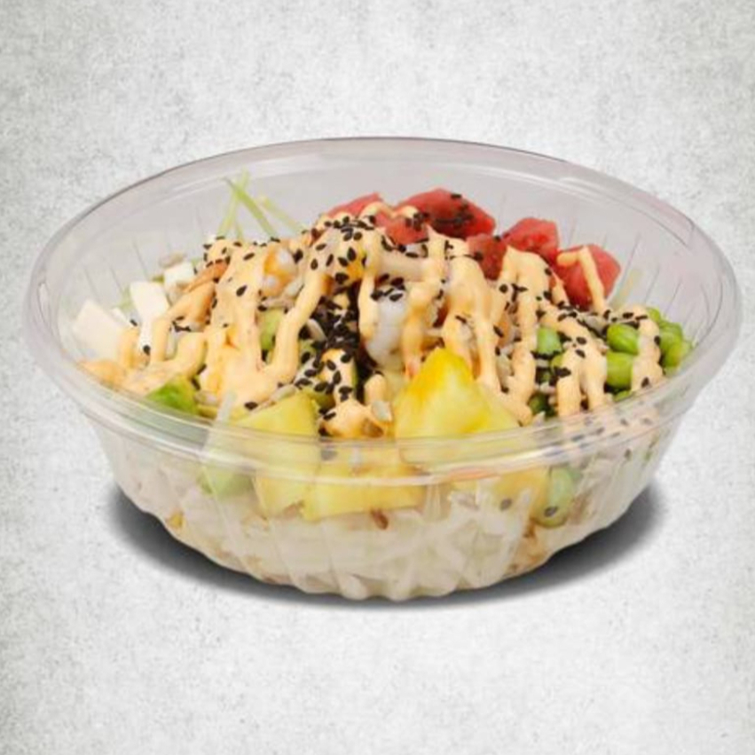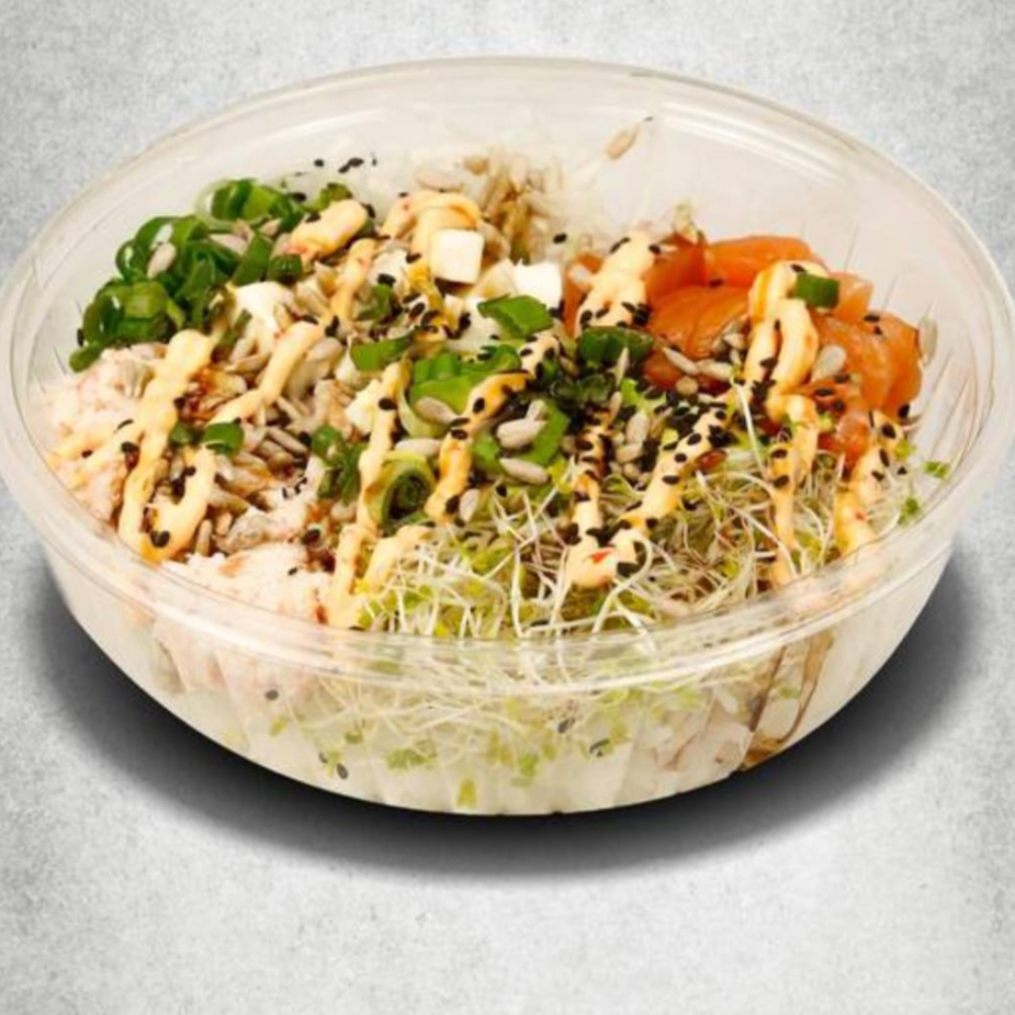 base arroz blanco proteina tampico y salmon toppings garminado de alfalfa cebollin aguacate semillas de girasol queso crema aderezos spicy y ponsu
