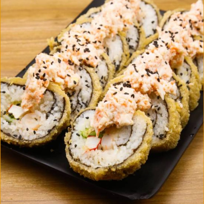 Surimi, camaron, aguacate y queso crema por dentro, por fuera capeado con tampico y un toque de aderezo chipotle.