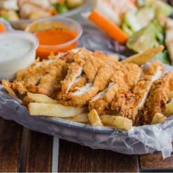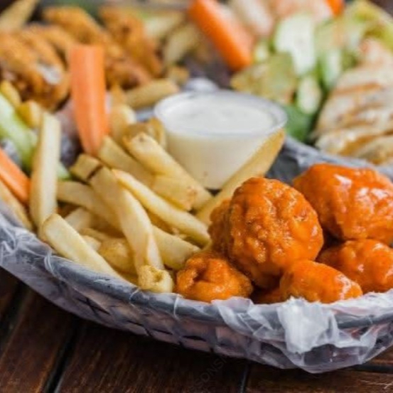 Deliciosos trocitos de pechuga empanizados y sazonados, bañados en la salsa de elección y acompañados de aderezo, papas fritas, apio y zanahorias.