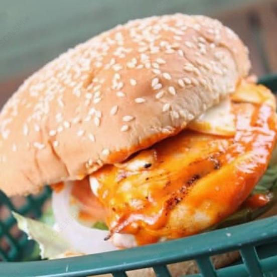 Deliciosa pechuga de pollo asada a la parrilla bañada en salsa de tu elección con queso panela de hamburguesa y aderezo blue cheese.