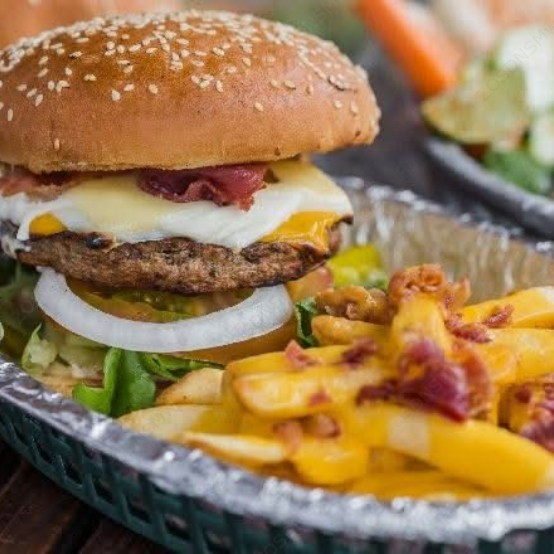 Le pusimos tocino doradito y salsa BBQ a la tradicional del oso con 150 g de carne de arrachera, con aderezo especial, pepinillos, tomate, cebolla, lechuga, queso amarillo, acompañada de papas fritas.